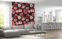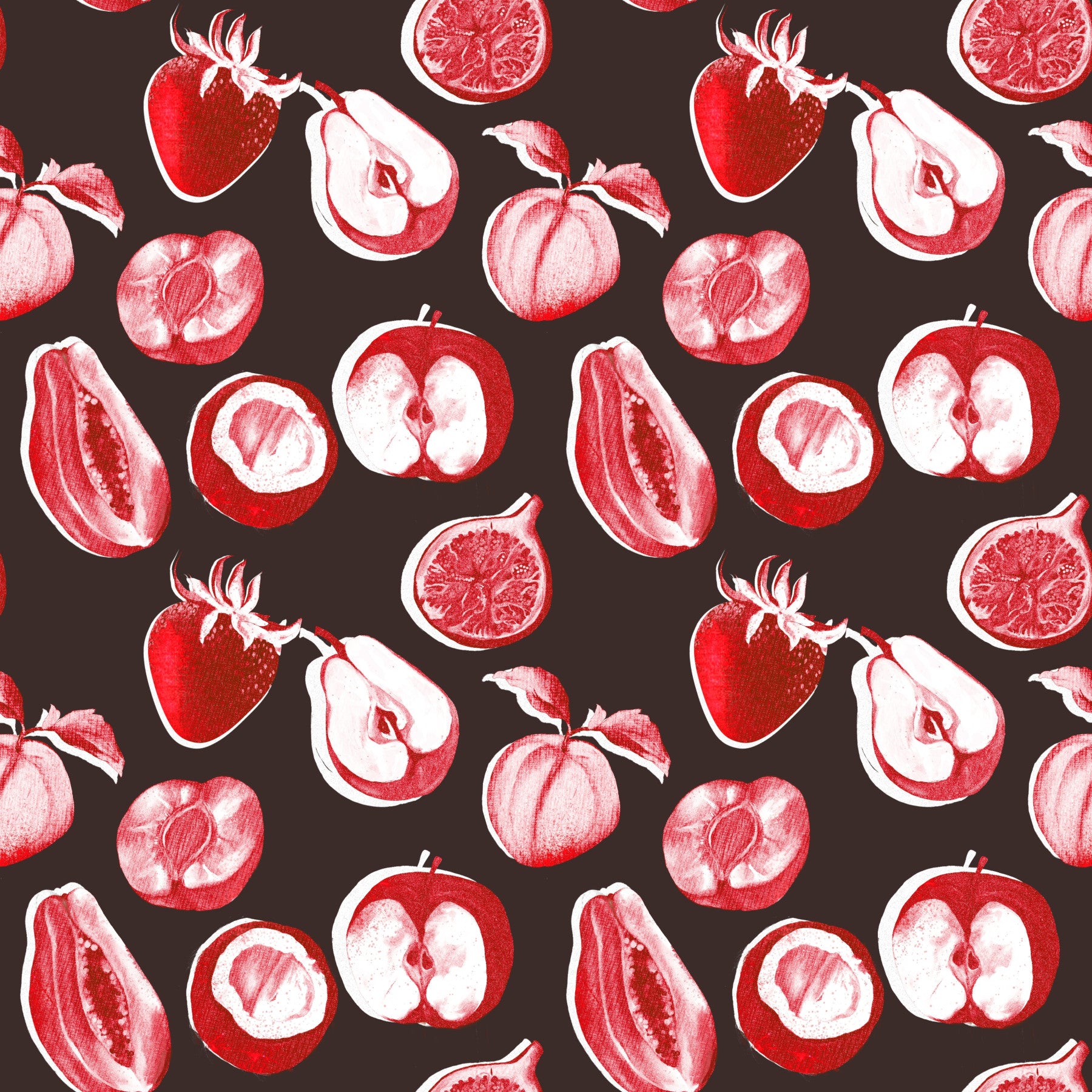 Verleihen Sie Ihren Räumen mit dieser auffälligen Tapete im Frucht-Design einen besonderen Touch. Die Tapete zeigt ein handgezeichnetes Muster mit roten und weißen Früchten auf dunkelbraunem Hintergrund. Lebendig, saftig, rubinrot, karminrot, scharlachrot, kirschrot, Granatapfel, reif, glänzend, sonnenverwöhnt, köstlich, frisch gepflückt, vom Obstgarten inspiriert, botanisch, naturgetreu, detailreich, strukturiert, leuchtend, satt, kräftig, fruchtig, sommerlich, süß, spritzig, natürlich, Erntezeit, saisonal, aus dem Garten, realistisch, detailreich, malerisch, sanft schattiert, plastisch, lebendiger Kontrast, warmtonig, appetitlich, frisch