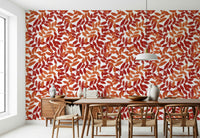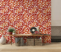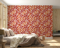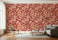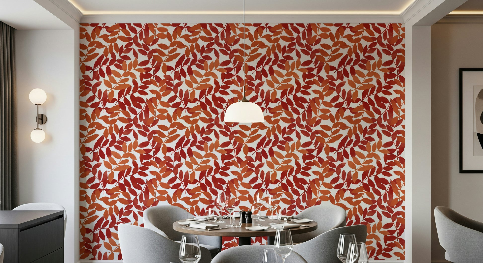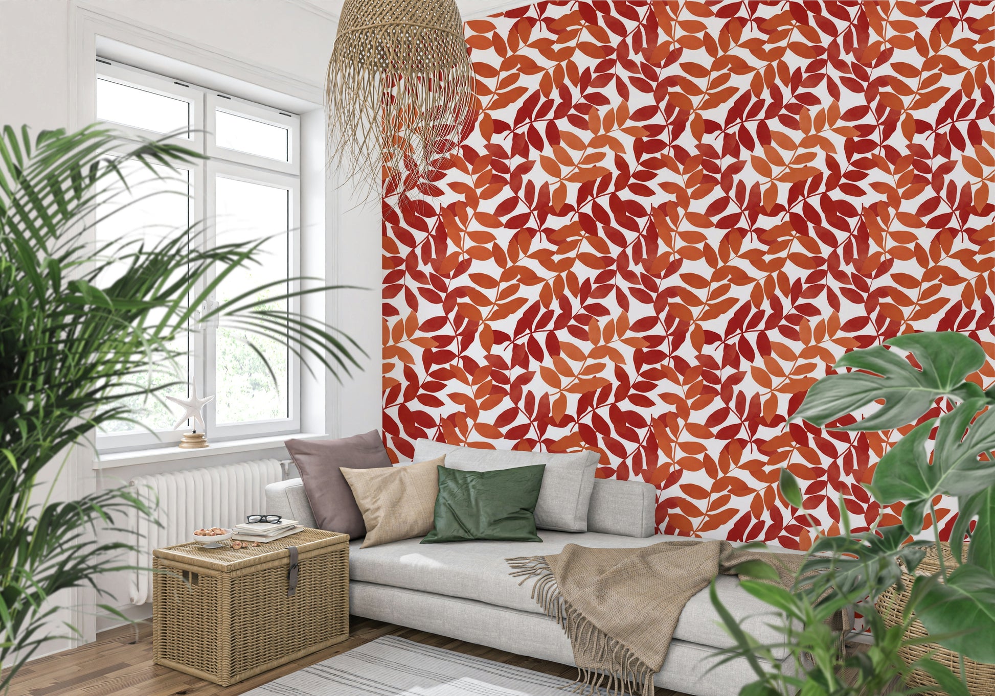 Verleihen Sie Ihren Räumen mit diesem atemberaubenden Blättermuster die Wärme der Natur. Rostfarbene Blätter schweben über einen klaren, weißen Hintergrund und schaffen eine einladende Atmosphäre. Diese Wandtapete eignet sich perfekt für Eingangsbereiche, Wohn- oder Schlafzimmer und passt ideal zu Räumen, die einen Hauch von rustikalem Charme und schlichter Eleganz suchen. Die markanten, organischen Formen setzen optische Akzente, ohne den Raum zu erdrücken. Die Kombination aus warmen Farbtönen auf weißem Grund hellt den Raum auf und schafft eine behagliche Atmosphäre. Verschönern Sie Ihre Inneneinrichtung mit diesem botanischen Druck – ein zeitloser Akzent für jedes Zuhause.