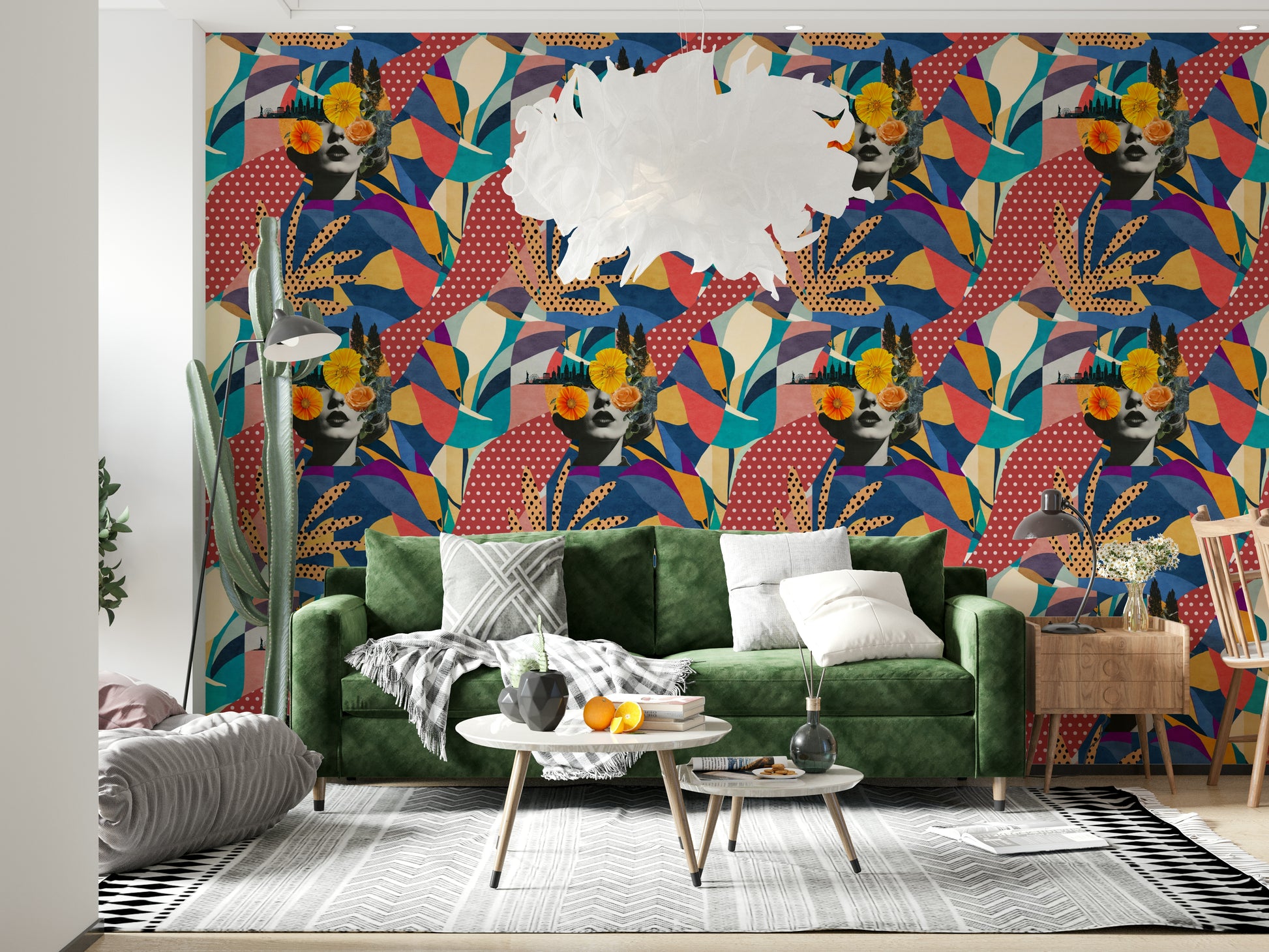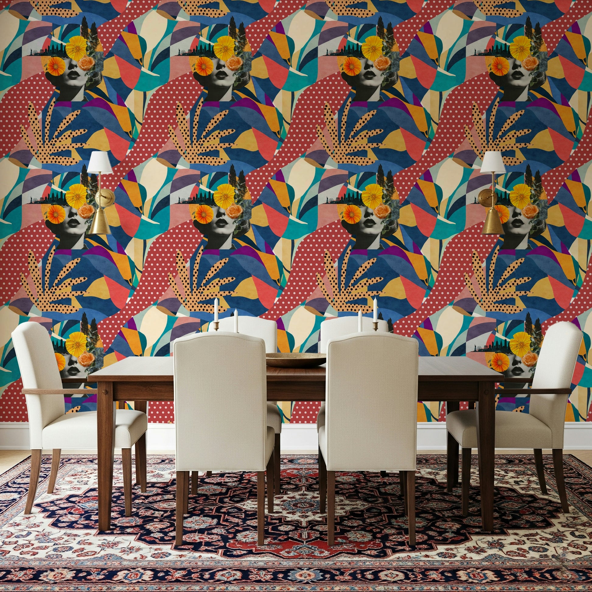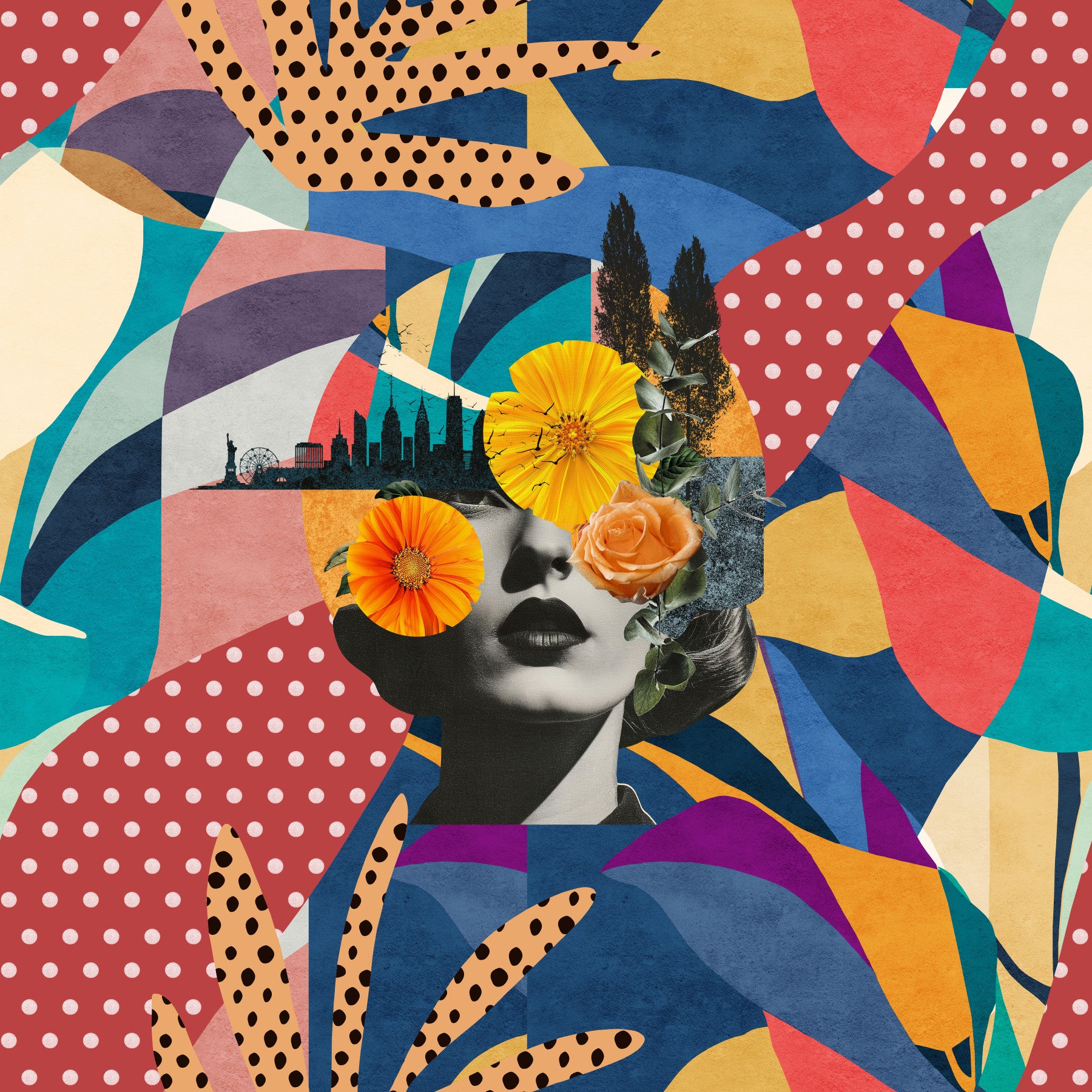 Tauchen Sie Ihr Zuhause in die pulsierende Energie von „Urban Muse“ ein – einer faszinierenden Collage, die den Reiz des Stadtlebens mit der zarten Schönheit der Natur harmonisch vereint. Dieses Kunstwerk präsentiert ein Porträt im Vintage-Stil, überlagert von ausdrucksstarken, abstrakten Mustern in einer reichen Palette aus Blau-, Rot- und Gelbtönen. Die Silhouette einer geschäftigen Stadtlandschaft mit ihren ikonischen Wahrzeichen schmückt dezent den Hintergrund, während zarte florale Akzente einen Hauch von organischem Charme verleihen. Das Ergebnis ist ein anspruchsvolles und zugleich verspieltes Design, das jedem Raum Leben einhaucht und ihm eine geheimnisvolle und moderne Eleganz verleiht. Die unverwechselbare Kombination aus geometrischen Formen und organischen Motiven macht dieses Kunstwerk zu einem Blickfang und einem faszinierenden Mittelpunkt, der die Ästhetik Ihres persönlichen Rückzugsortes aufwertet.