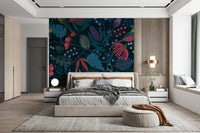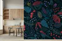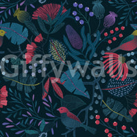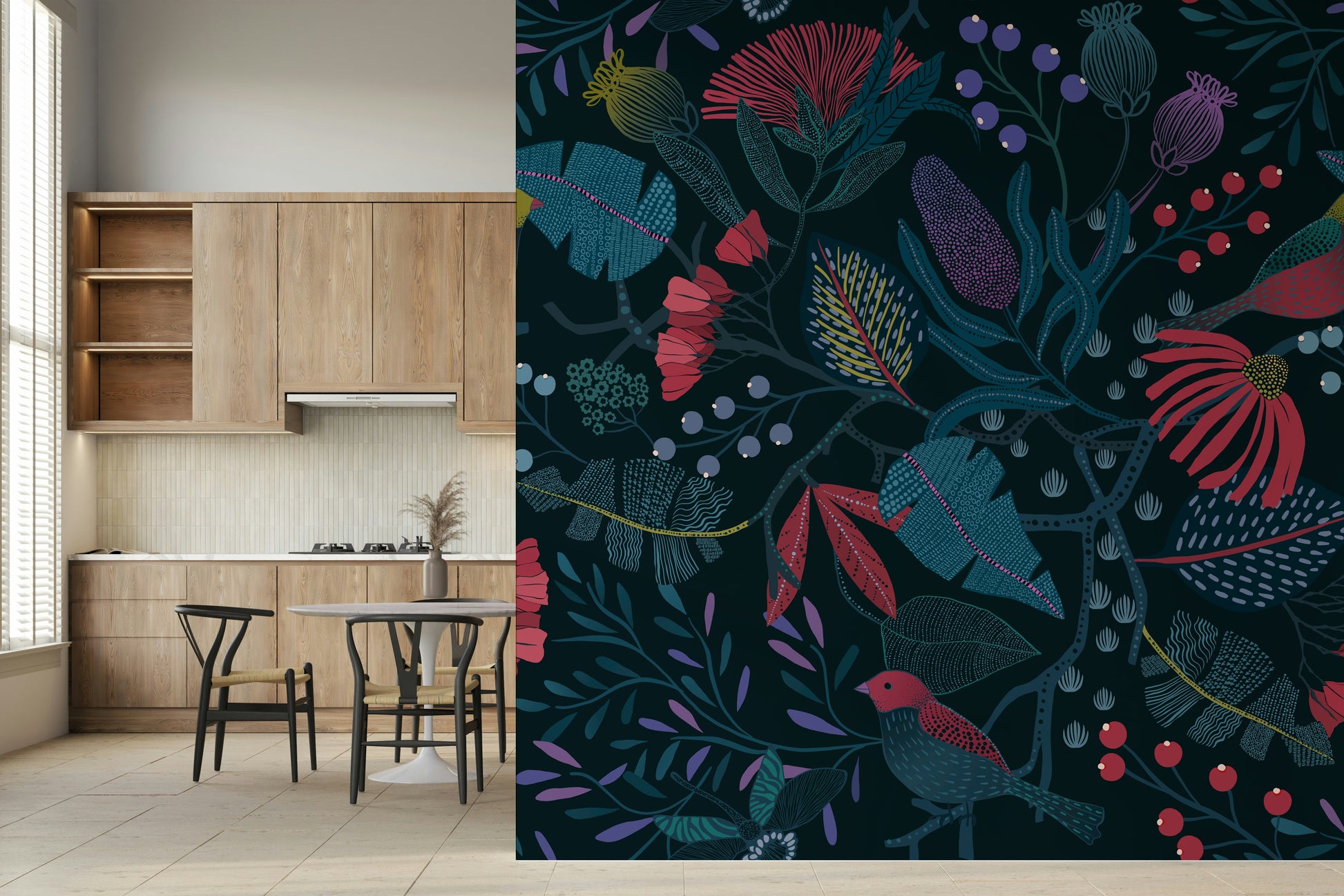Entfliehen Sie dem Alltag und tauchen Sie ein in die bezaubernde Welt von „Wonderforest“, einer faszinierenden Tapete, die Ihrem Wohnraum einen Hauch von zauberhafter Wildnis verleiht. Lassen Sie sich von einem Teppich aus stilisierten Pflanzen und Tieren verzaubern, wo leuchtende Blüten und strukturierte Blätter sich vor einem satten, dämmerungsfarbenen Hintergrund verweben. Entdecken Sie charmante, stilisierte Vögel, die zwischen Zweigen voller bunter Beeren sitzen und so ein Gefühl von verborgenem Leben und friedvoller Harmonie erzeugen. Die filigranen Details und die raffinierte Farbpalette schaffen eine Atmosphäre von Eleganz und Geheimnis und verwandeln jeden Raum in eine Oase natürlicher Schönheit. Holen Sie sich den friedvollen Zauber eines verborgenen Gartens in Ihr Zuhause, wo jeder Blick ein neues Detail dieser faszinierenden botanischen Szenerie offenbart.