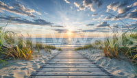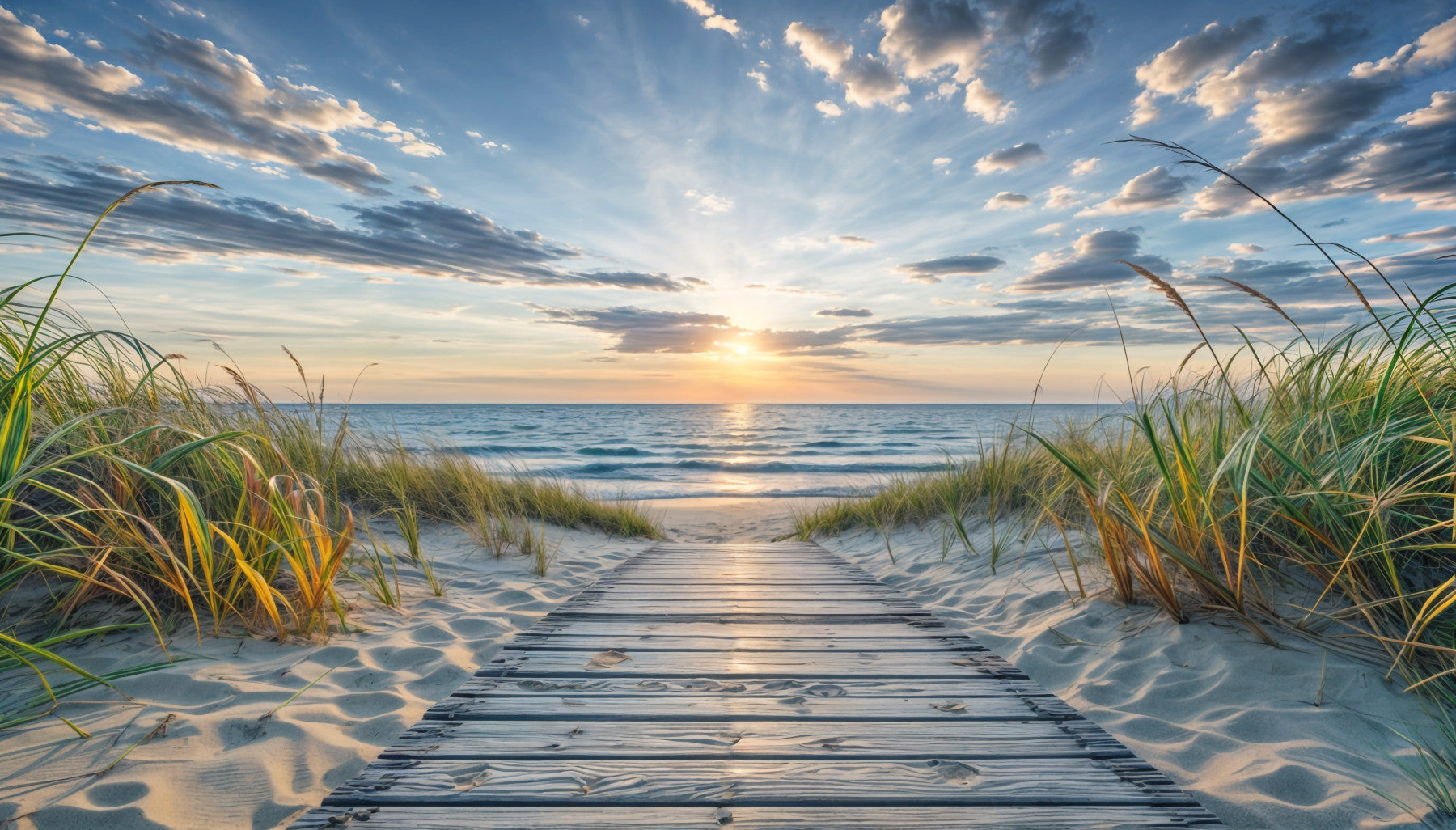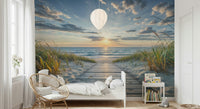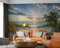 Holen Sie sich mit dieser wunderschönen Tapete die Ruhe des Meeres nach Hause. Ein Holzsteg führt zu einem idyllischen Strand, der in die sanften Farben der untergehenden Sonne getaucht ist. Sanfte Wellen umspülen das Ufer unter einem Himmel in beruhigenden Blau- und Orangetönen. Die natürlichen Farben von Sand und Seegras schaffen eine wohltuende, natürliche Atmosphäre. Dieses Design eignet sich hervorragend für Schlafzimmer, Badezimmer oder jeden anderen Raum, in dem Sie eine entspannte, maritime Stimmung erzeugen möchten. Verschönern Sie Ihr Zuhause mit diesem friedvollen Anblick.