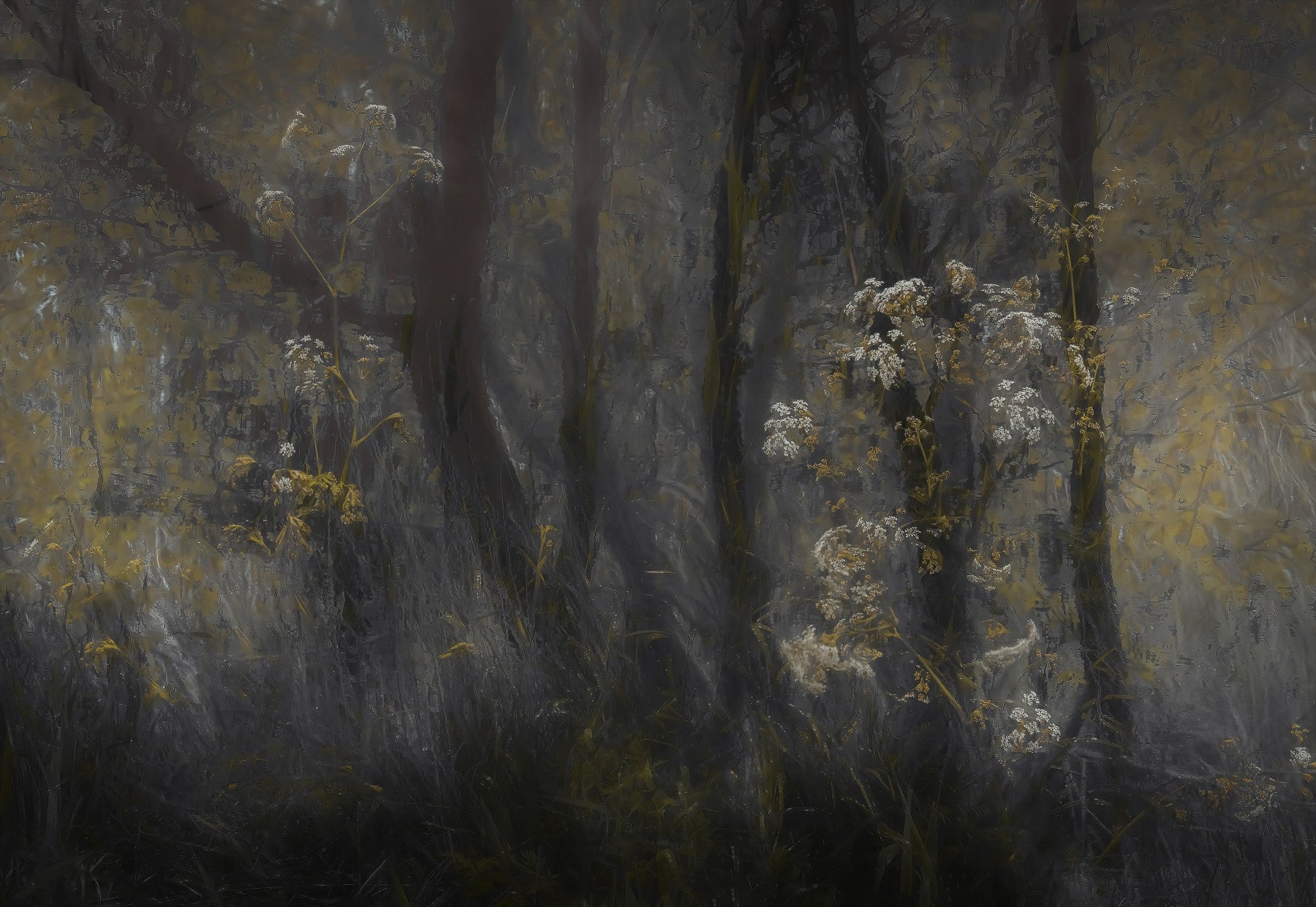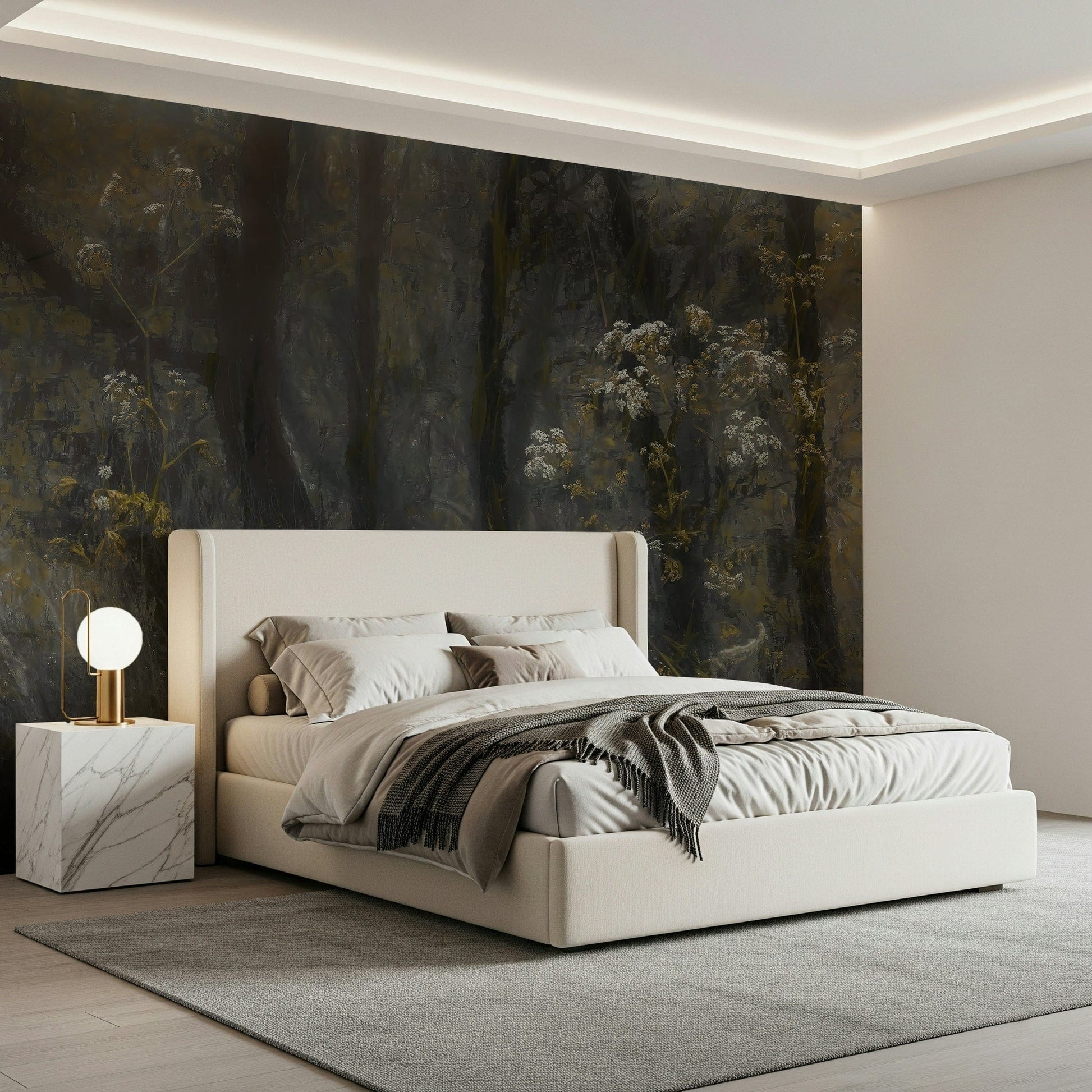 Transform your space with this evocative wallpaper for walls. It presents a stylized forest scene, with touches of white and yellow florals against a dark, muted backdrop. The design lends a tranquil and sophisticated mood, working particularly well in living rooms, bedrooms, or hallways where you want to create a serene atmosphere. The subtle color palette ensures it integrates beautifully, adding texture and depth without overwhelming the existing decor. This design brings the quiet beauty of nature indoors.