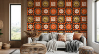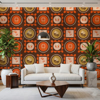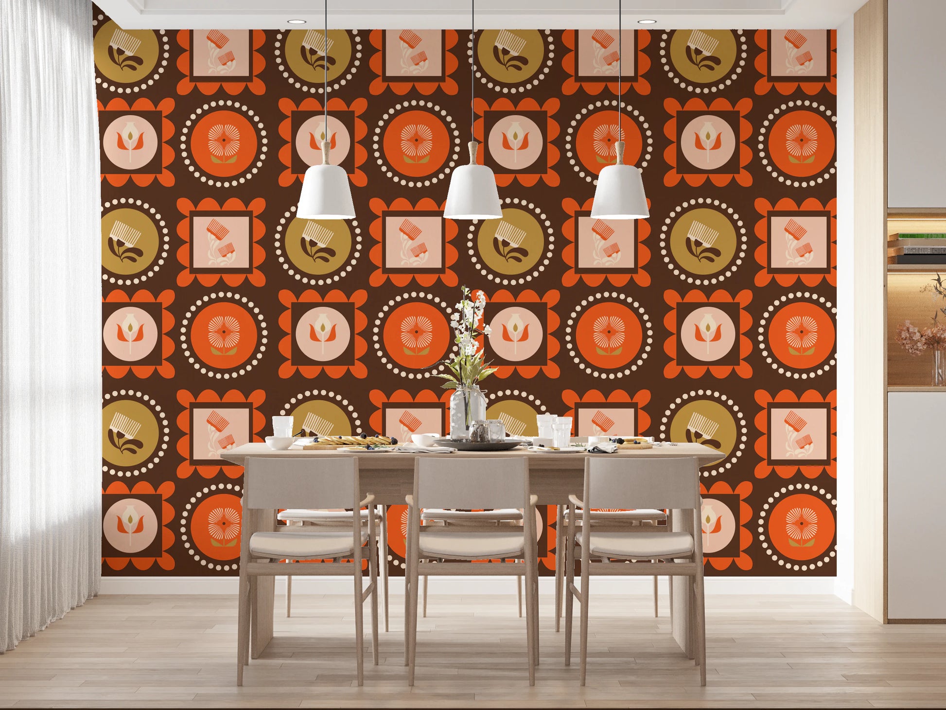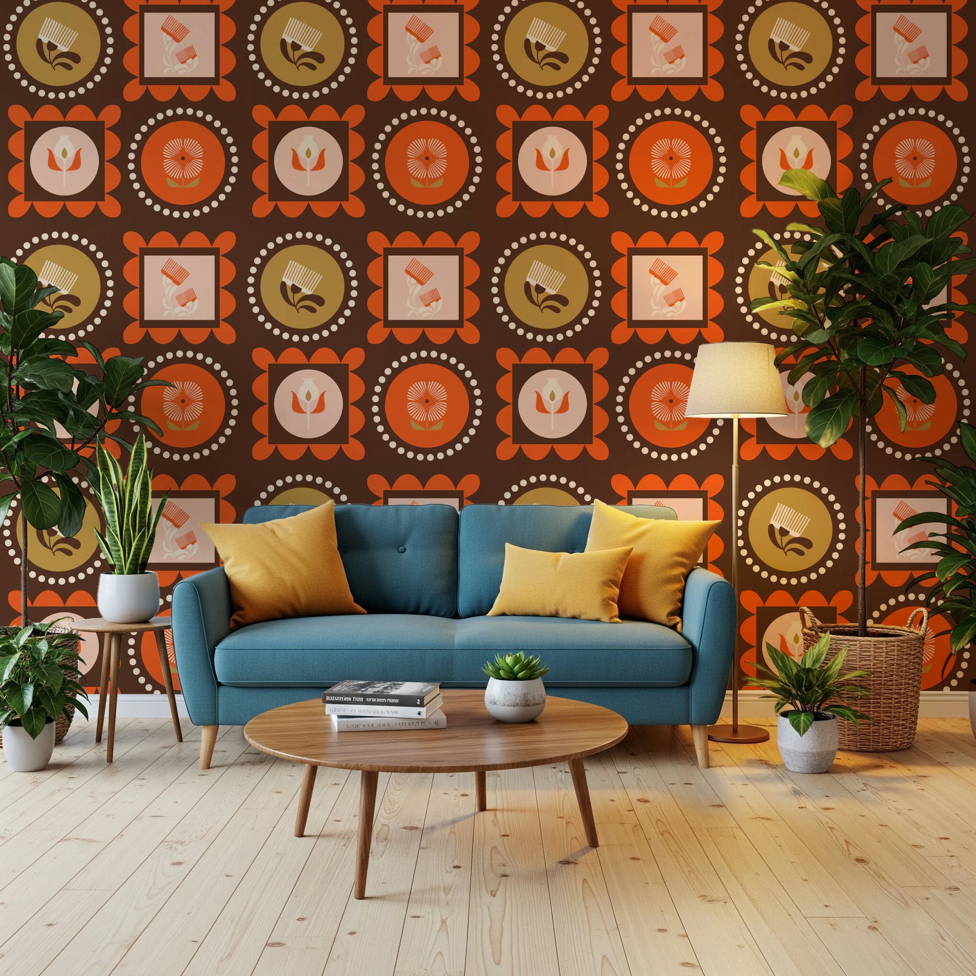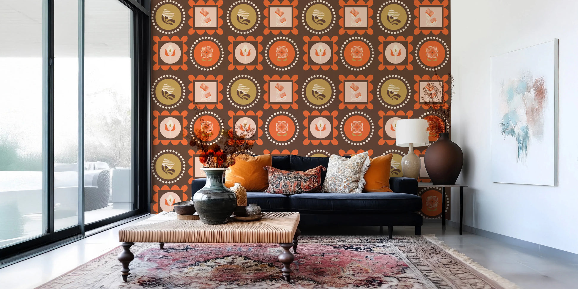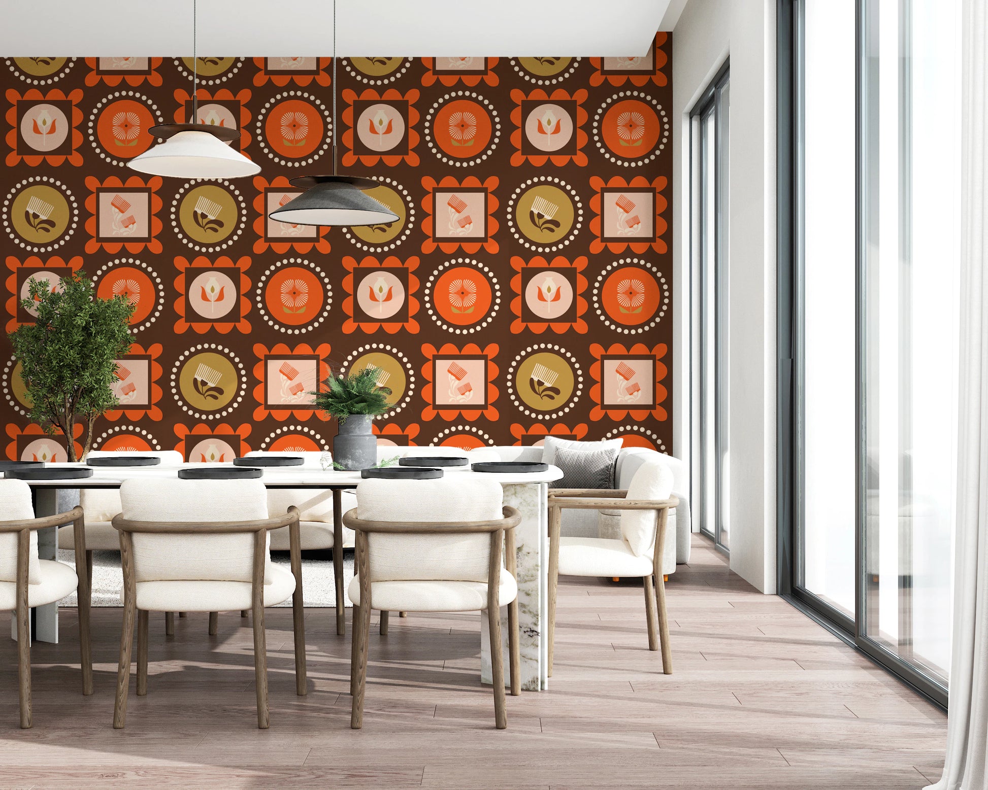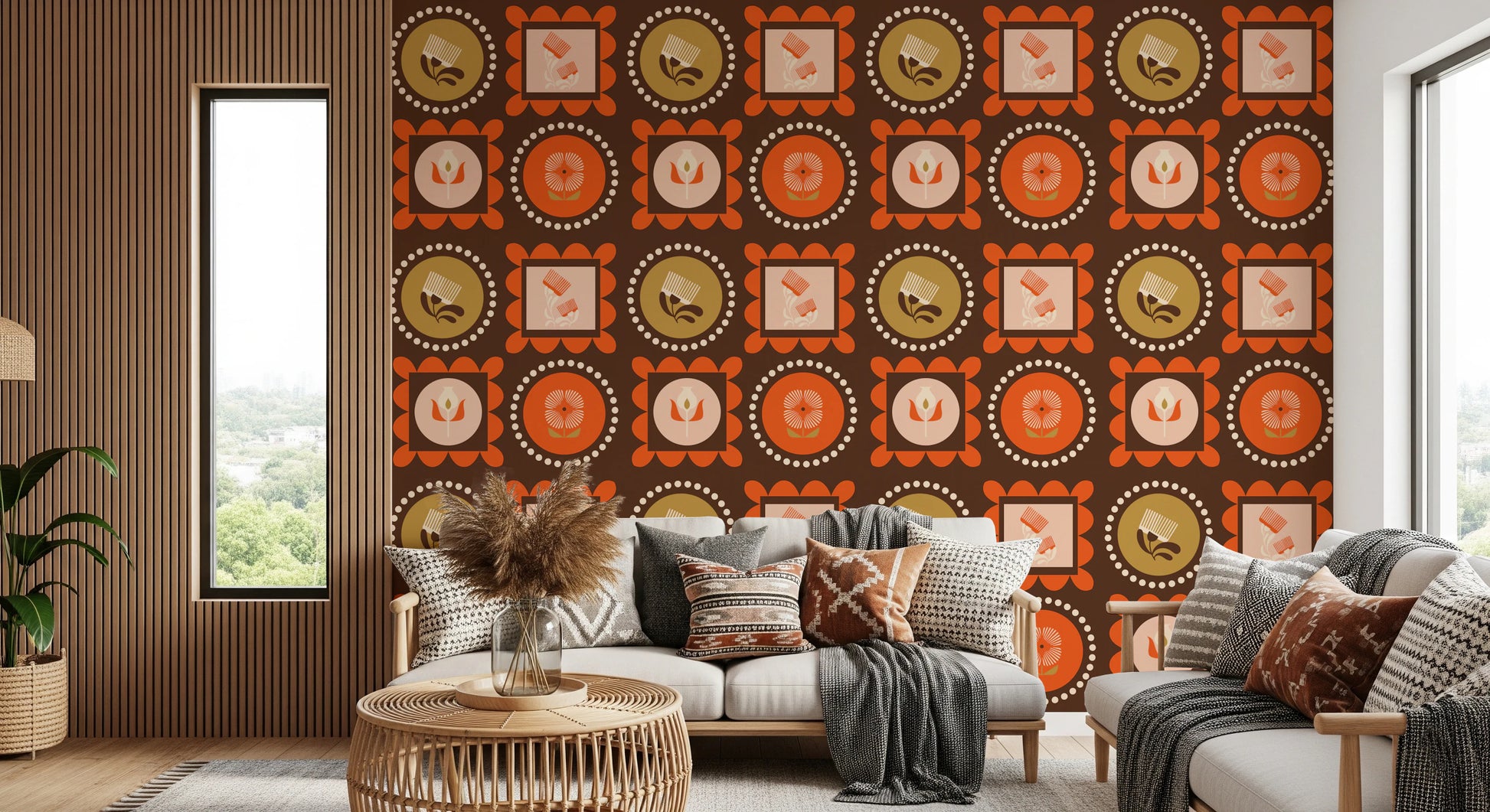 Mid-Mod-Wildblumenrahmen – Botanische Collage-Tapete in Schokoladenbraun und Terrakotta