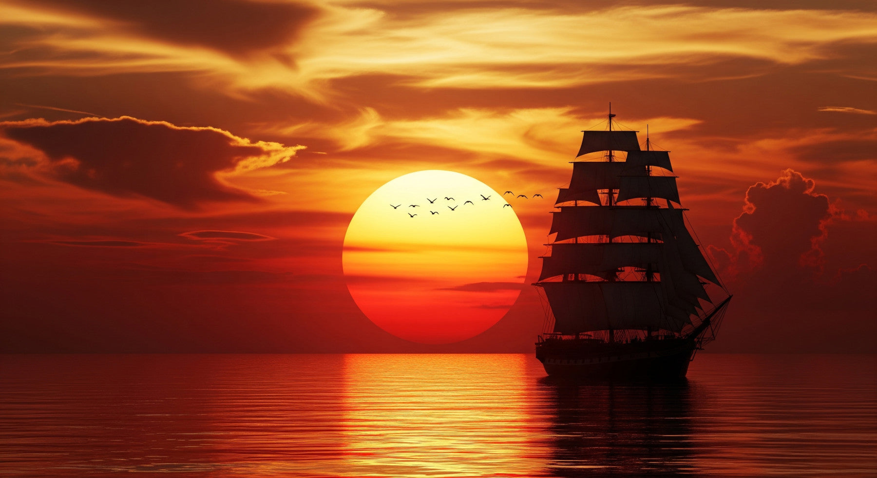 Verwandeln Sie jeden Raum mit dem warmen Glanz dieser maritimen Wandtapete. Das eindrucksvolle Motiv zeigt ein Segelschiff, das im sanften Licht des Sonnenuntergangs über das ruhige Wasser gleitet. Die feurigen Rot- und Orangetöne harmonieren perfekt mit einem Arbeits- oder Esszimmer, während die Silhouette des Schiffes einen Hauch von Geheimnis verleiht. Das Design schafft einen Blickfang und lässt den Raum größer wirken. Der Vogelschwarm, der in den Sonnenuntergang fliegt, sorgt für eine subtile, verspielte Note. Verleihen Sie Ihrer Einrichtung Eleganz, indem Sie diese Tapete als Akzentwand verwenden.