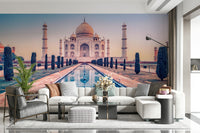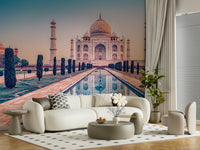Verwandeln Sie Ihre Wohnräume mit der Tapete „Agras Juwel“. Dieses Motiv fängt das majestätische Taj Mahal im sanften Licht eines Sonnenaufgangs ein und bringt ein weltberühmtes Wahrzeichen in Ihr Zuhause. Das Design besticht durch sanfte Blau- und warme Orangetöne und schafft eine beruhigende und elegante Atmosphäre. Die Spiegelung im Vordergrund unterstreicht die symmetrische Schönheit der Architektur – ideal für Akzentwände in Wohnzimmern, Schlafzimmern oder Arbeitszimmern. Erleben Sie die Verbindung von Geschichte und Kunst, die ein stilvolles und raffiniertes Statement setzt. Lassen Sie Ihre Wände Geschichten von architektonischer Pracht und kultureller Bedeutung erzählen.