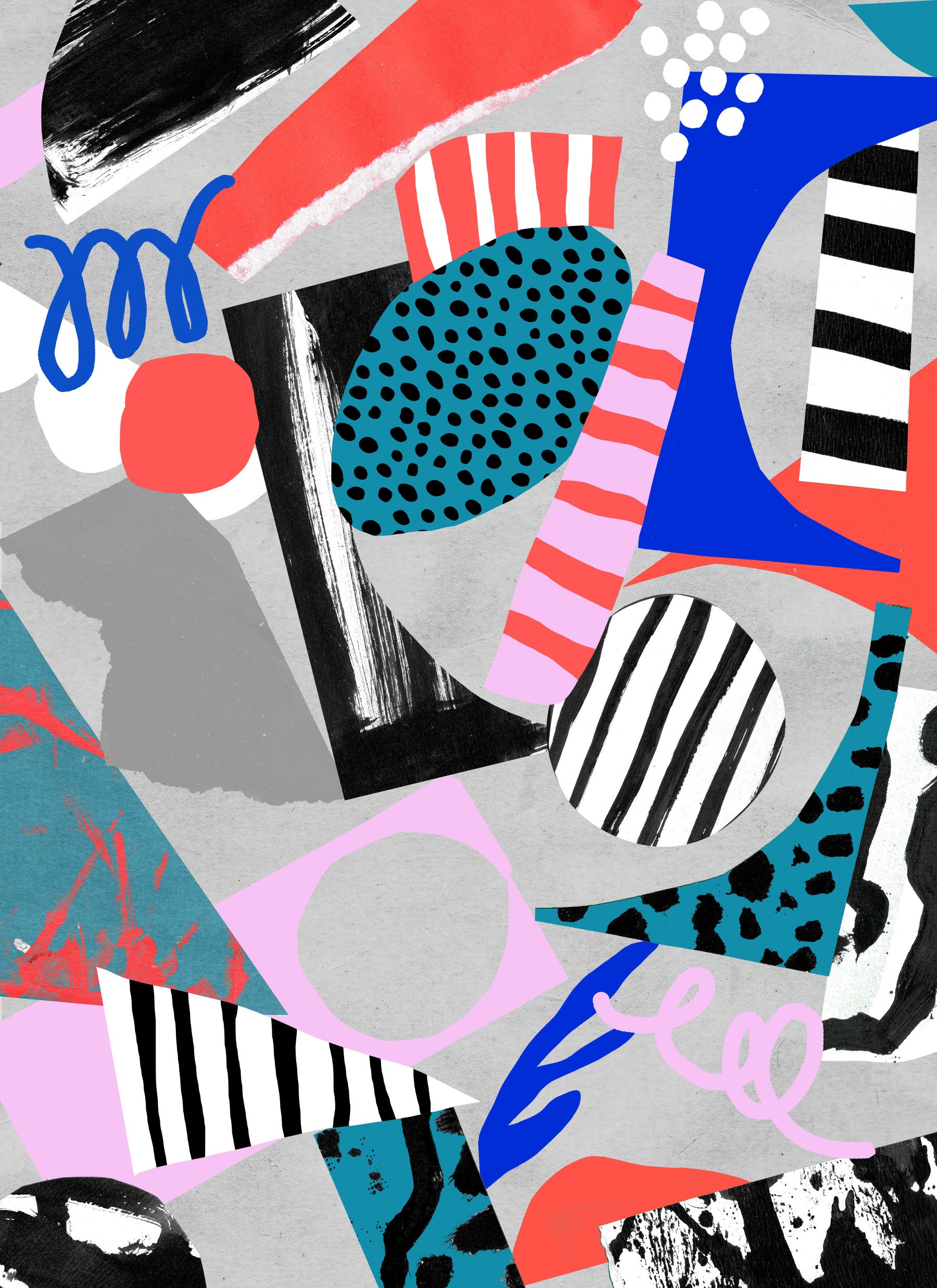 Dive into the dynamic rhythm of 'Everything Goes Around,' a vibrant wallpaper that captures the essence of perpetual motion and interconnectedness. Bold shapes collide and interact in a spirited dance of color and texture. This collage-inspired design features a playful juxtaposition of stripes, dots, brushstrokes, and geometric forms, all swirling against a subtly textured grey backdrop. Shades of coral, blue, pink, and graphic blacks and whites create a visually stimulating and balanced composition. It evokes a sense of playful energy, reminding us that life is a continuous cycle of change and re-invention. Let this wallpaper add a touch of modern art and whimsical flair to any room, inviting you to embrace the beautiful chaos and cyclical nature of existence. More than just a design, it's a vibrant philosophy for your walls.