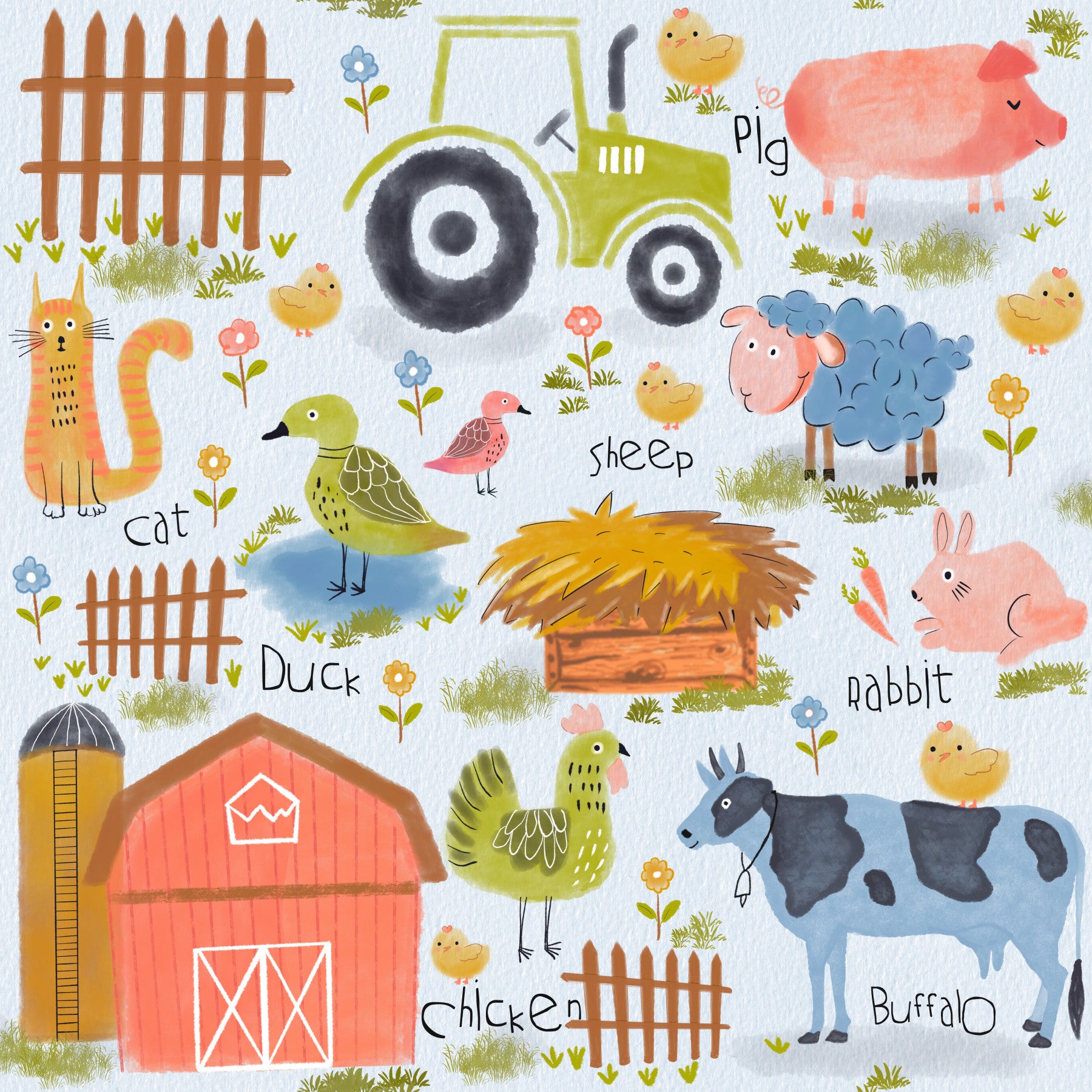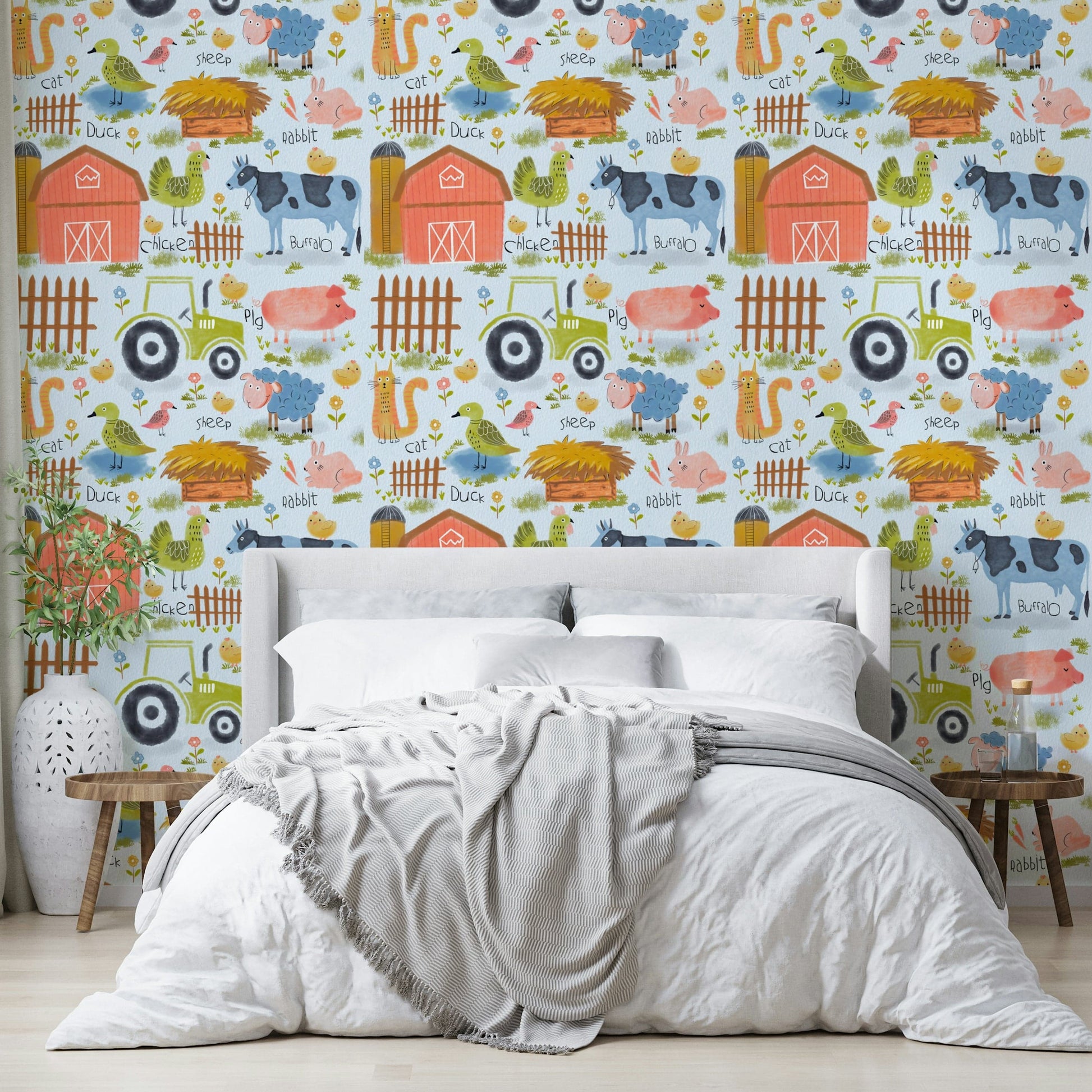 Bring the charm of the countryside inside with this delightful wallpaper for walls. This adorable design features watercolor-style farm animals like pigs, cows, sheep, and chickens, along with a barn, tractor, and cute little chicks. The soft, pastel colors create a cheerful and inviting atmosphere. This playful wallpaper is perfect for a nursery, kids' room, or playroom. It adds a touch of whimsy and complements playful interiors with a happy vibe.