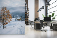 Diese faszinierende Tapete für Wände verwandelt jeden Raum in eine ruhige Winteroase. Sie zeigt eine malerische Landschaft, bedeckt mit frischem Schnee, mit sanft geschwungenen Hügeln, die zu einem charmanten gelben Haus führen. Rauch steigt sanft aus dem Schornstein und verleiht der kühlen Szenerie eine gemütliche Wärme. Ein auffälliger Baum mit goldenen Blättern, teilweise mit Schnee bedeckt, steht lebhaft im Vordergrund und schafft einen schönen Kontrast. Die Farbpalette verbindet das klare Weiß und sanfte Blau der verschneiten Hügel und nebligen Berge mit den einladenden Gelb- und Orangetönen des Hauses und Baums. Dieses Design bringt eine friedliche und ruhige Atmosphäre in Wohnzimmer, Schlafzimmer oder sogar ein stilles Homeoffice. Es verbessert Innenräume, indem es sofort ein Gefühl von Ruhe und eine tröstliche Verbindung zur stillen Schönheit der Natur schafft.