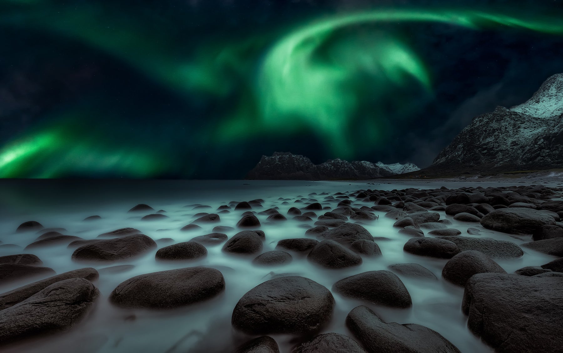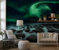 Invite the magic of the Aurora into your home. This landscape captures the glowing green lights dancing above a serene beach with a stone shoreline. It features snow-covered mountains, adding to its tranquil appeal. This nature-inspired wallpaper for walls is an ideal choice for a study, living room, or bedroom where you want to foster a feeling of calm and natural beauty. Its dark and light play complements any decor.