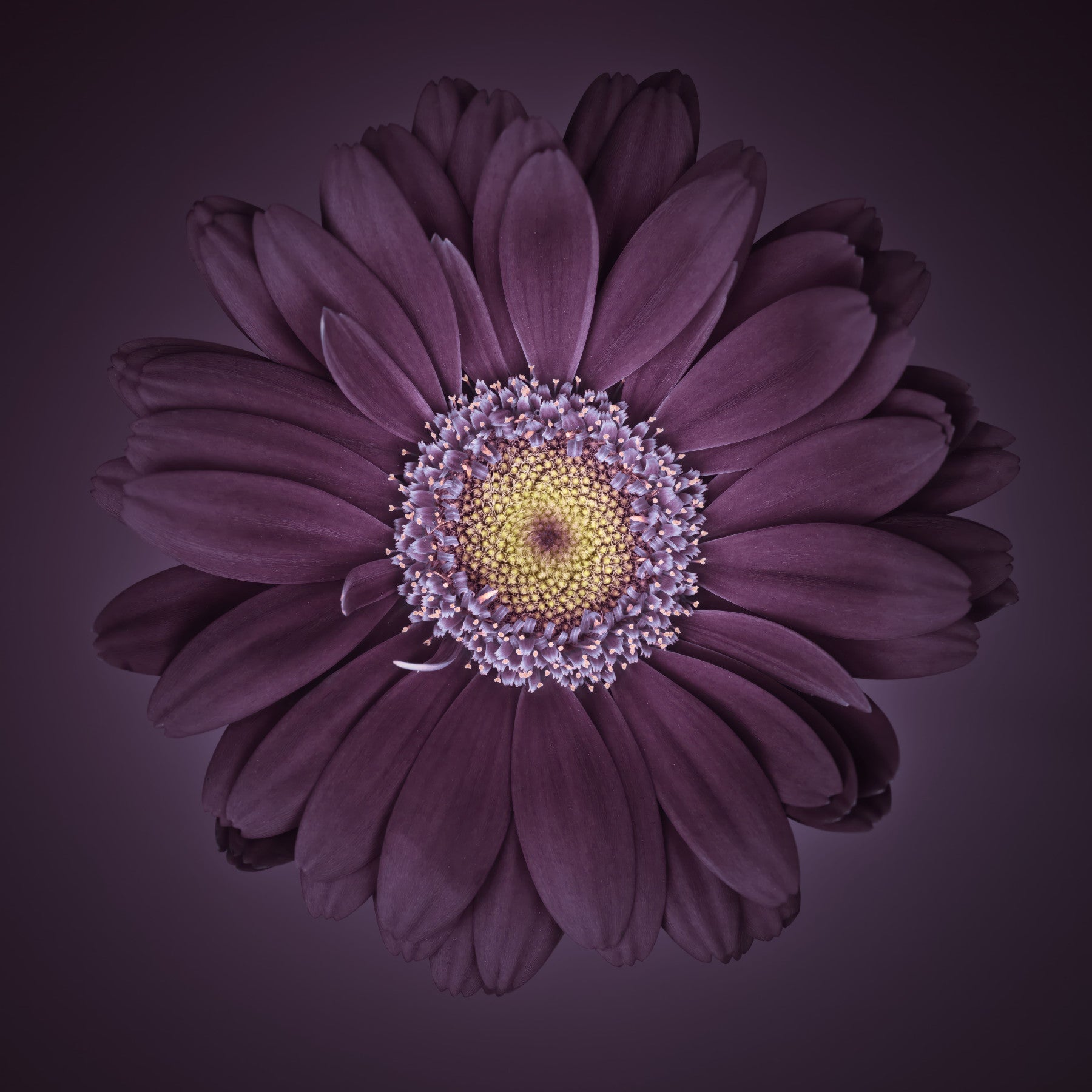 Gönnen Sie sich der opulenten Schönheit von "Velvet Bloom", einer Tapete mit einem reichhaltigen, tief lila Gerbera Daisy. Jedes Blütenblatt erscheint exquisit strukturiert wie weicher Samt, was eine luxuriöse und raffinierte Ästhetik erzeugt. Die zentrale Scheibe, eine faszinierende Mischung aus Lavendel und Gold, verleiht einen Hauch von ätherischer Eleganz. Dieses Bild ruft ein Gefühl von ruhiger Anmut und zurückhaltender Opulenz hervor, perfekt für diejenigen, die eine beruhigende, aber visuell auffällige Kulisse für ihre digitalen Geräte suchen. Die tiefen lila Töne schaffen ein Gefühl von Geheimnis und Tiefe und verbessern die allgemeine luxuriöse und raffinierte Stimmung.