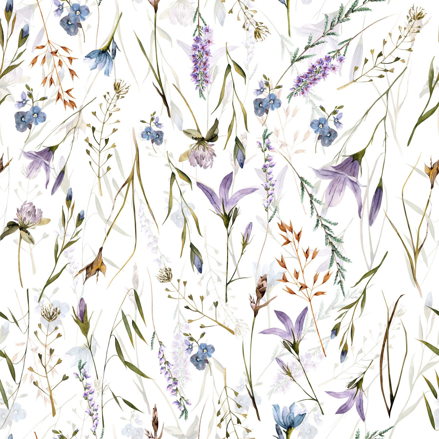 Bring the serene beauty of a wildflower meadow indoors with this delicate watercolor design by Uta Naumann. Light blues and soft purples blend harmoniously with the greens of the stems and leaves, all set against a bright white backdrop. This floral design works wonders as wallpaper for walls, adding a touch of nature's tranquility to living rooms, bedrooms, or even hallways. It complements Scandinavian, farmhouse, and cottagecore interiors perfectly, creating a restful, inviting space. The repeat pattern offers a continuous flow of floral beauty.