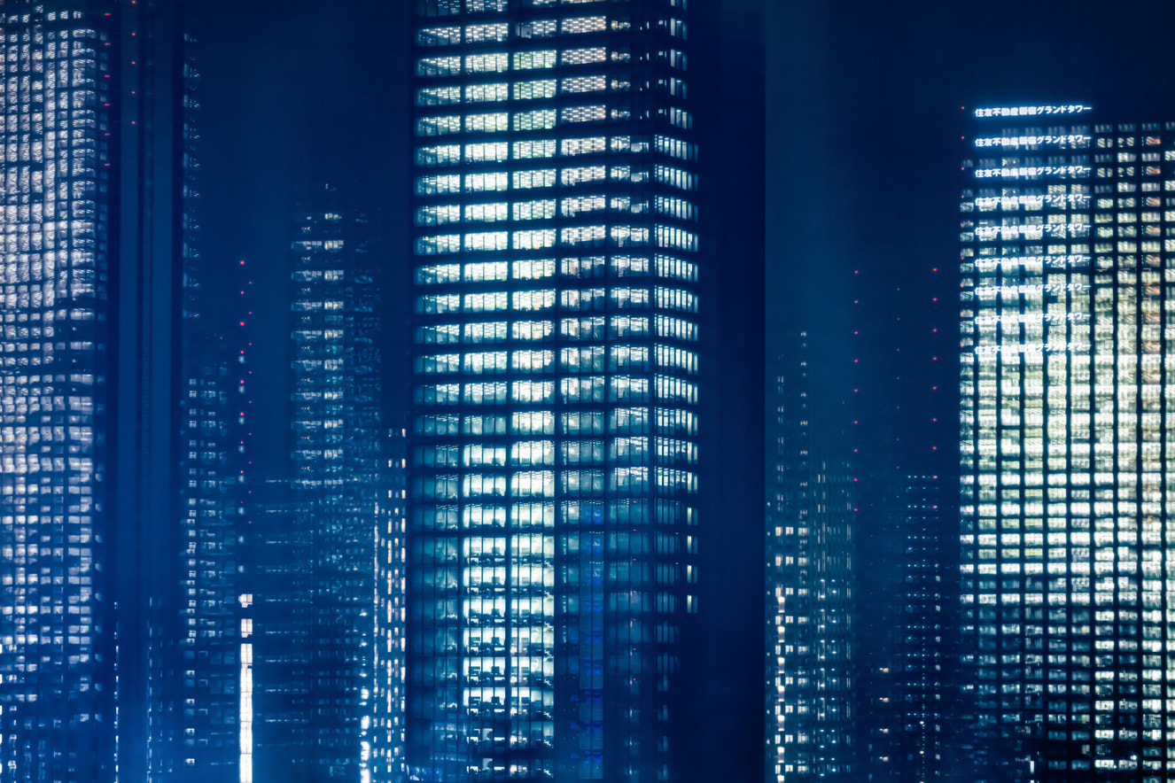 The urban skyline is a high-rise wallpaper, featuring tech-inspired buildings, towering skyscrapers, and sleek designs of the city, adding updated twists indoors. It's a metropolitan wall mural with a breathtaking night view and fast-forward lives of the metro cities.
