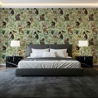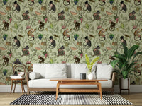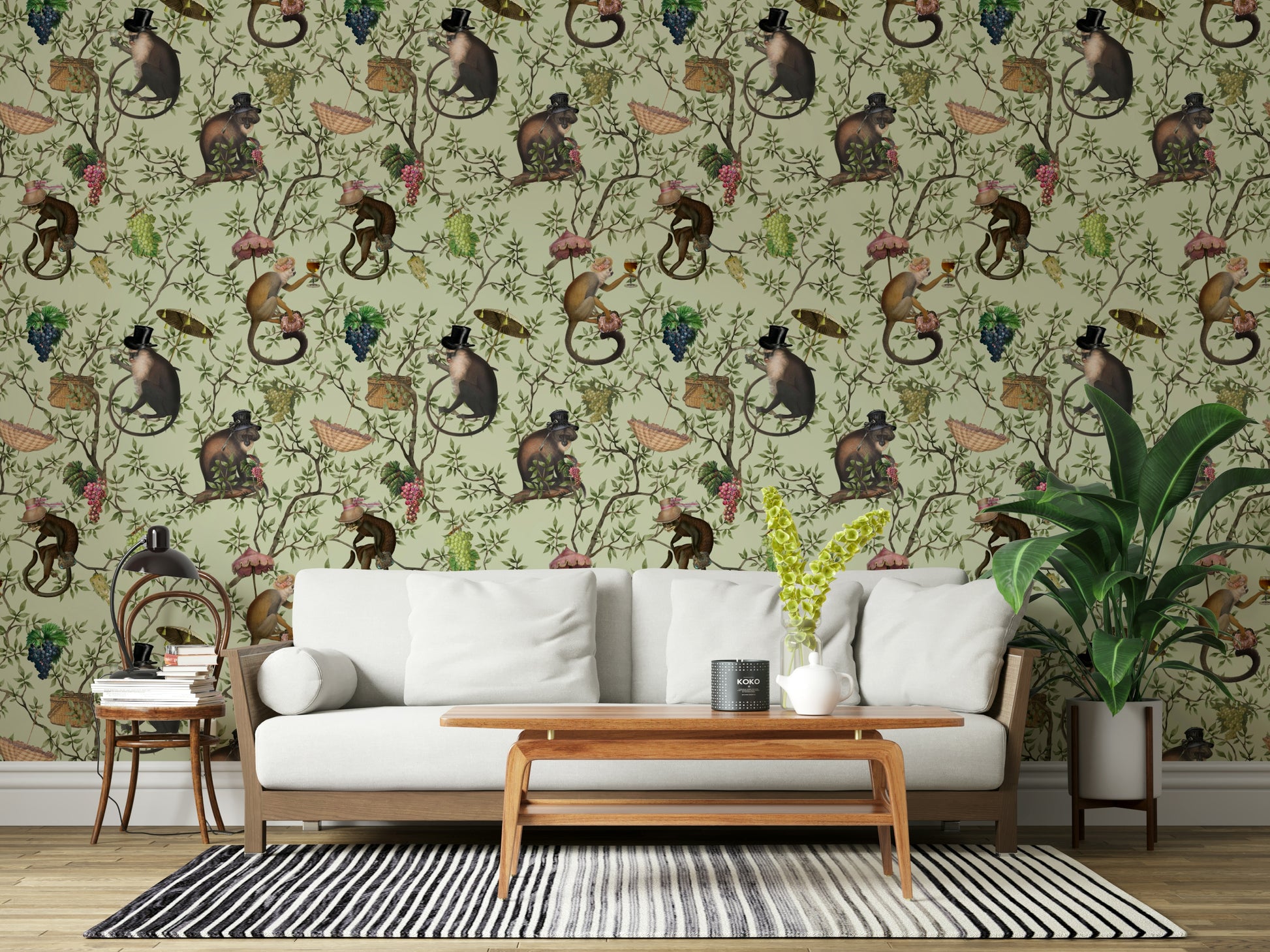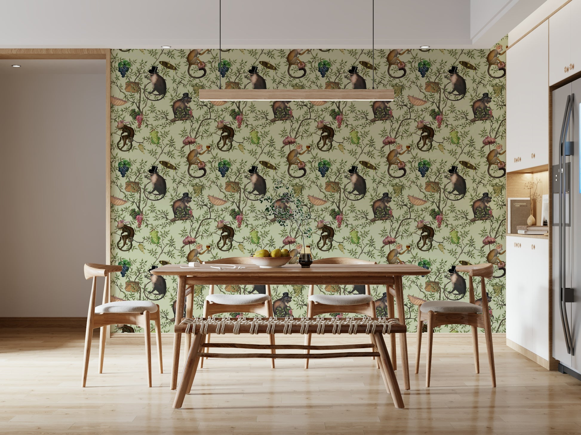 Escape to a world of refined elegance with 'A Primate's Afternoon Tea,' a unique wallpaper design showcasing stylish monkeys enjoying a delightful tea party amidst a picturesque garden setting. The delicate watercolor style brings a touch of vintage charm, with the pastel green background complementing the rich details of the monkeys' attire and the lush greenery. This wallpaper seamlessly blends playful animal motifs with sophisticated decor, creating an ambiance that is both whimsical and refined. Ideal for adding a touch of personality to any living space, this design brings an air of sophistication and lightheartedness to any room.