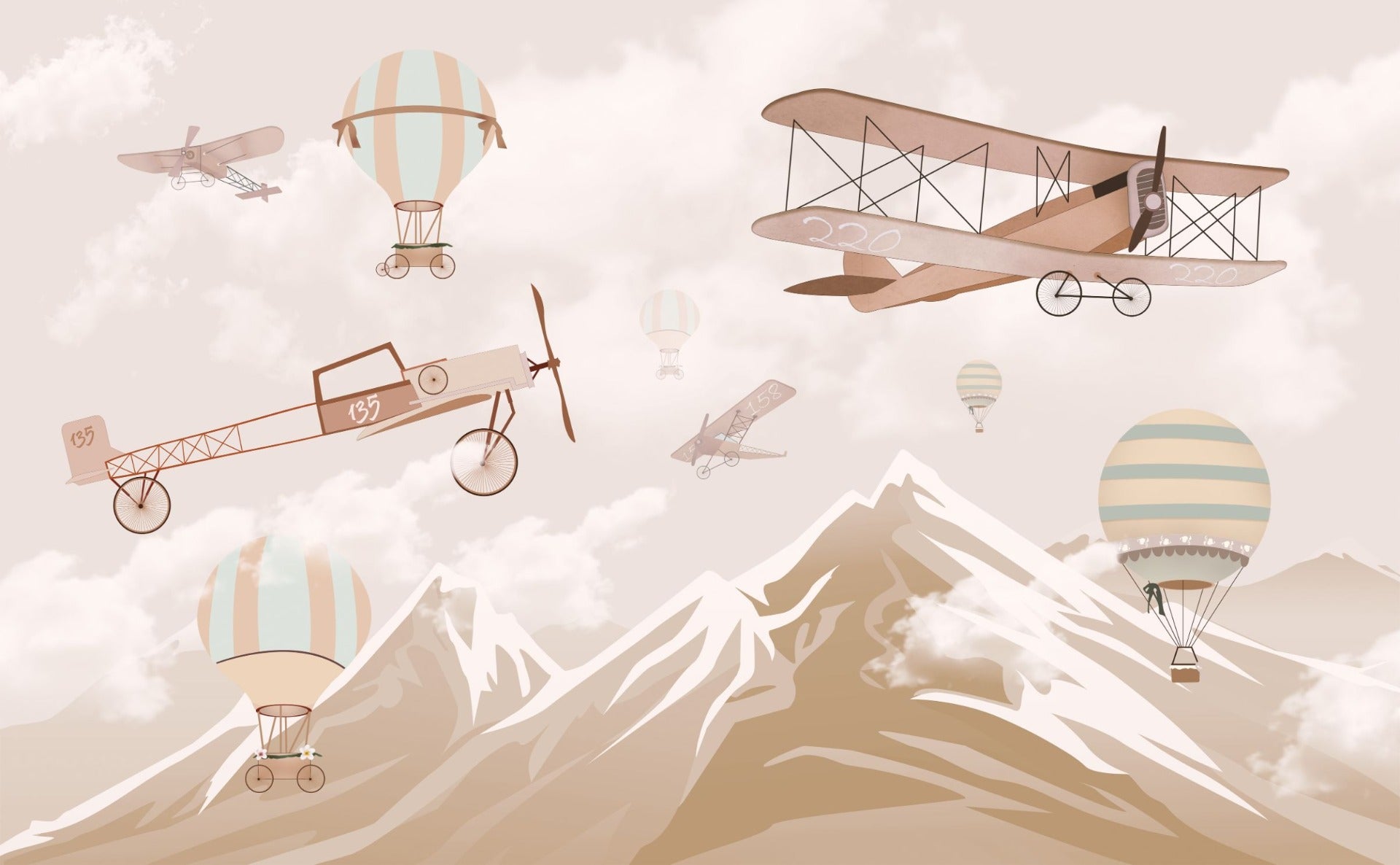 Transform your little one's space into a sky-high escape where stories take flight amidst the peaks and valleys of their very own mountain range. This airplane wallpaper for kids' rooms is more than just a decoration; it's an invitation to dream big and soar even higher. Watch as your child's eyes light up with wonder each time they step into their room, surrounded by the beauty of this mountain wallpaper crafted just for them.