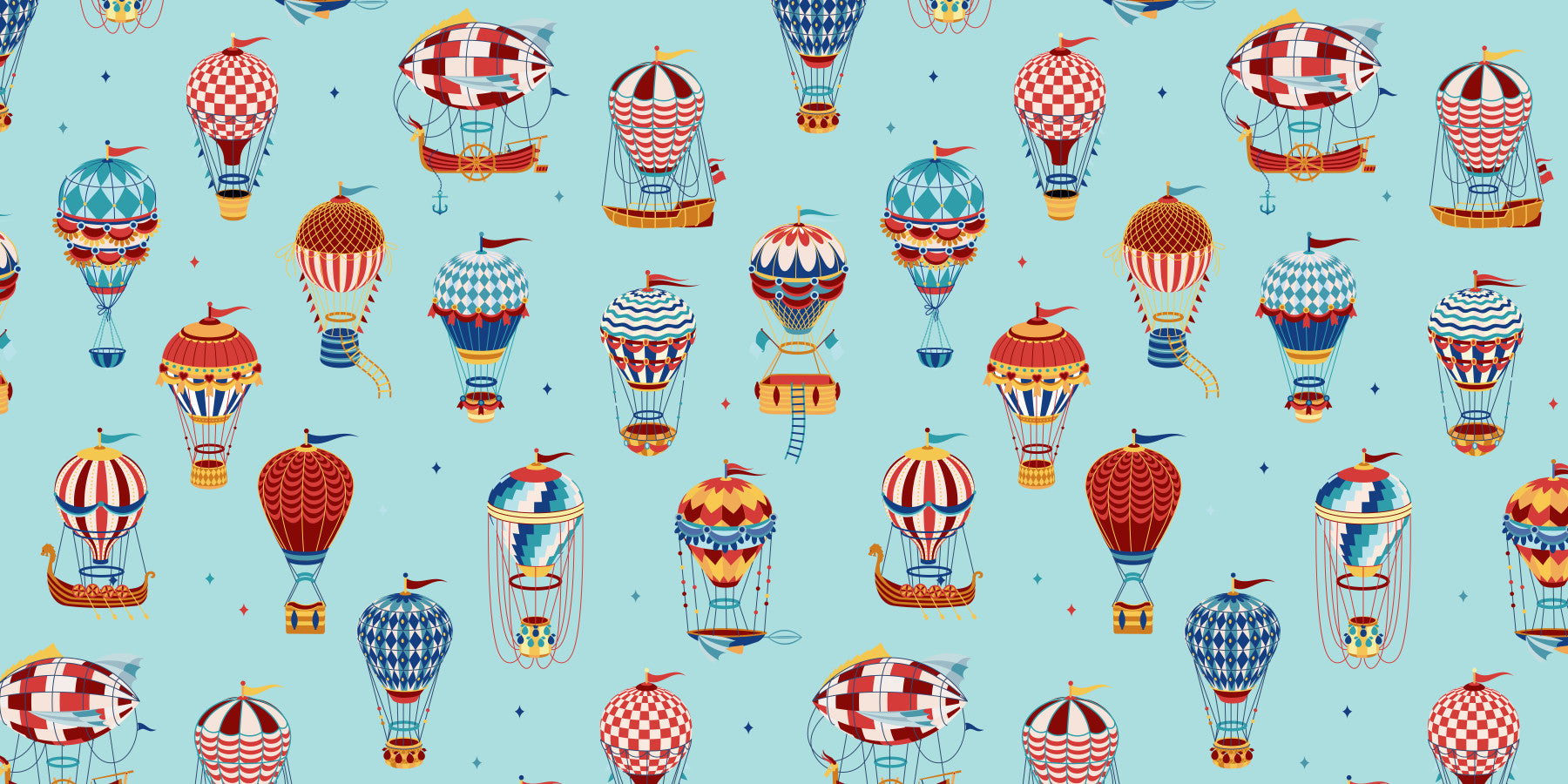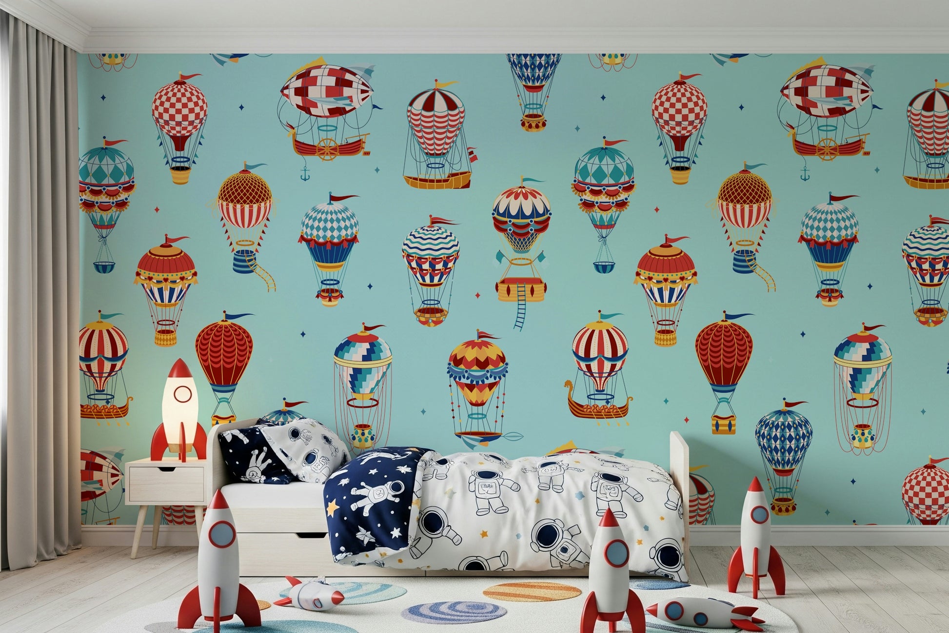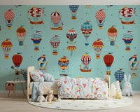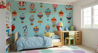 Take flight with this whimsical wallpaper for walls, featuring a colorful pattern of vintage hot air balloons. This fun design comes to life with shades of red, blue, and yellow against a sky-blue backdrop. It's perfect for a kid's room or playroom, sparking imagination and adding a touch of adventure. The playful style complements modern interiors and brings a sense of joy to any space.