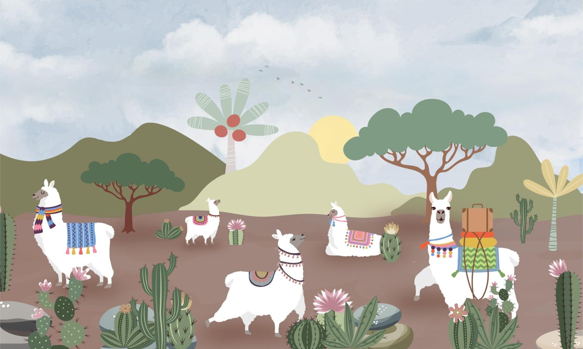 Imagine a gentle herd of alpacas, journeying across a softly-hued desert landscape, right on the walls of your child's room. This kids room wallpaper captivates young minds with its merry band of desert friends. Each alpaca wears a festive, woven blanket, adding a dash of color and charm to the room. It's a scene that enchants, inspires stories, and kindles the spirit of adventure in every young heart. Our Alpaca Desert Wall Mural is a perfect blend of fun and serenity for any child's personal oasis.