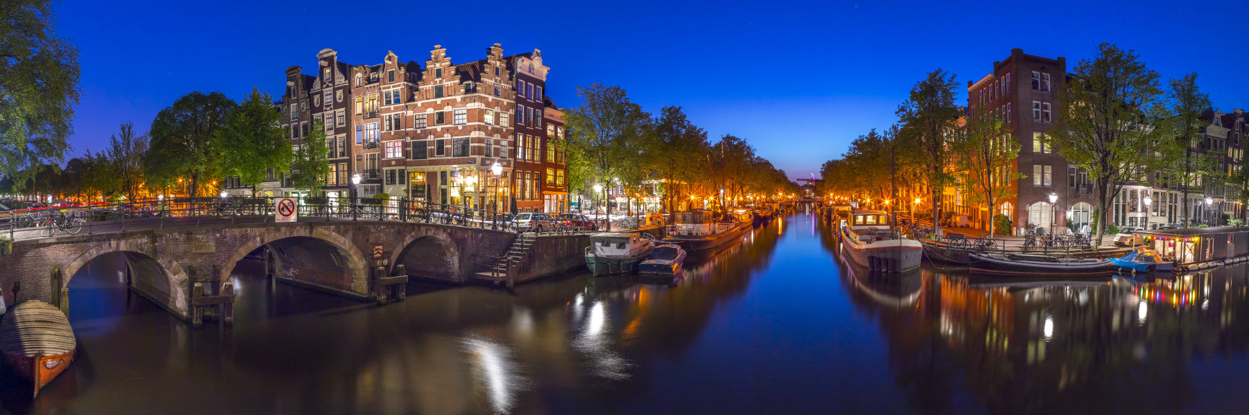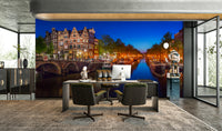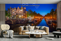 Evening view of Amsterdam city and canals. Bring the serene beauty of Amsterdam's canals at night to your home. This detailed image showcases the city's historic architecture, charming bridges, and tranquil waterways illuminated under a deep blue sky. Warm light pours from the windows, creating a cozy atmosphere. Use this wallpaper for walls to introduce a touch of European elegance to living rooms, bedrooms, or even a home office. The rich colors and reflections add depth and visual interest, perfectly complementing modern interiors.