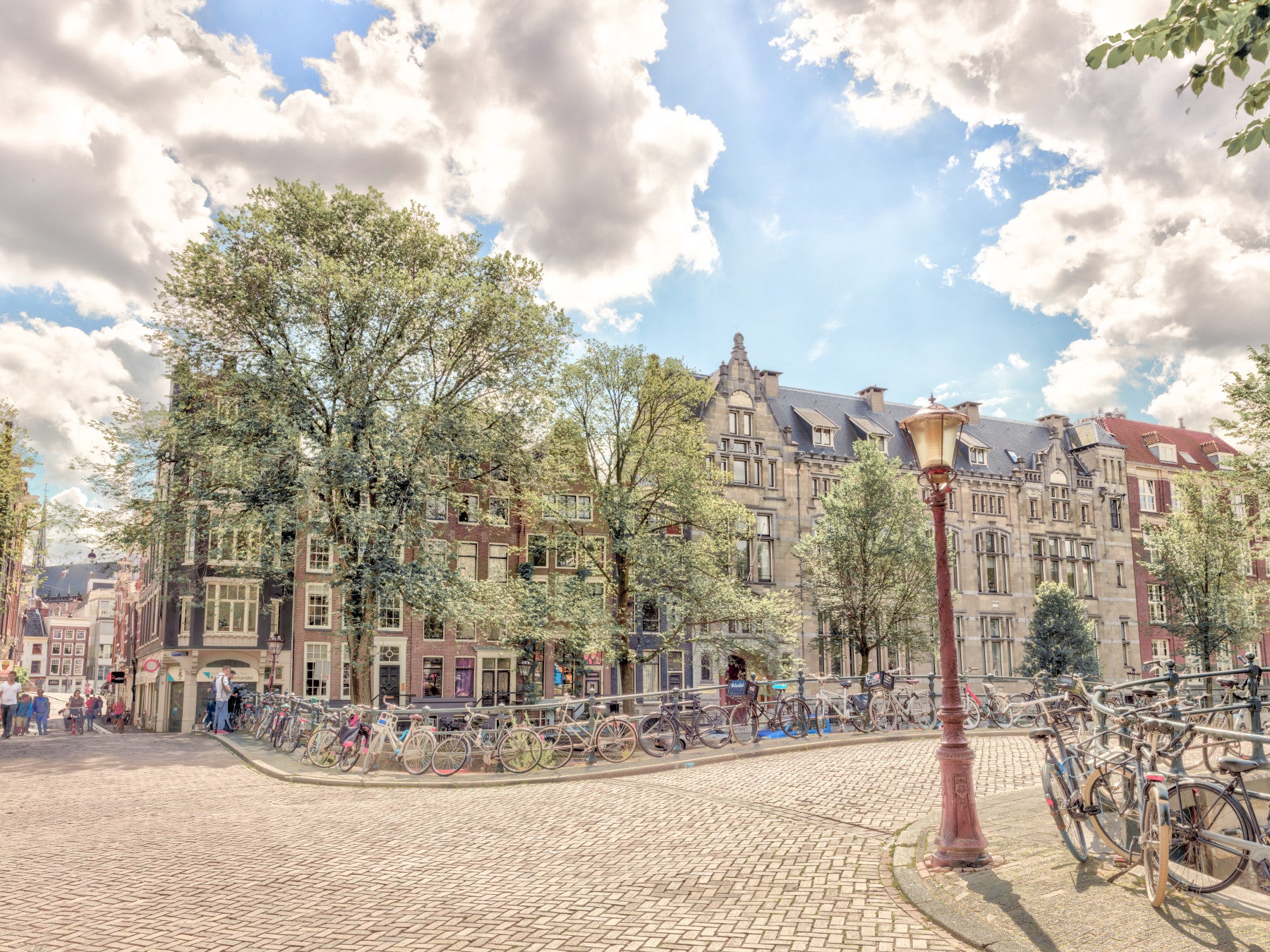 The Amsterdam Streets Wall Mural gives your home a feeling of charming, classic European life. This mural wallpaper shows a beautiful street scene in Amsterdam, with classic architecture, a large tree, and many bicycles parked along the cobblestone street. The vibrant colors and lively atmosphere are a simple way to get a unique and stylish look for your space. This high-quality wallpaper for walls is ideal for a living room, office, or dining area.
