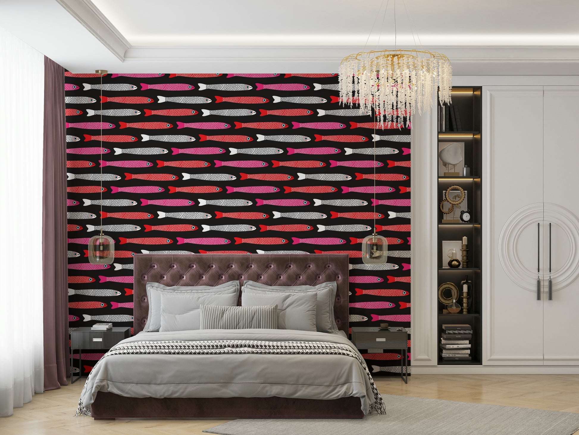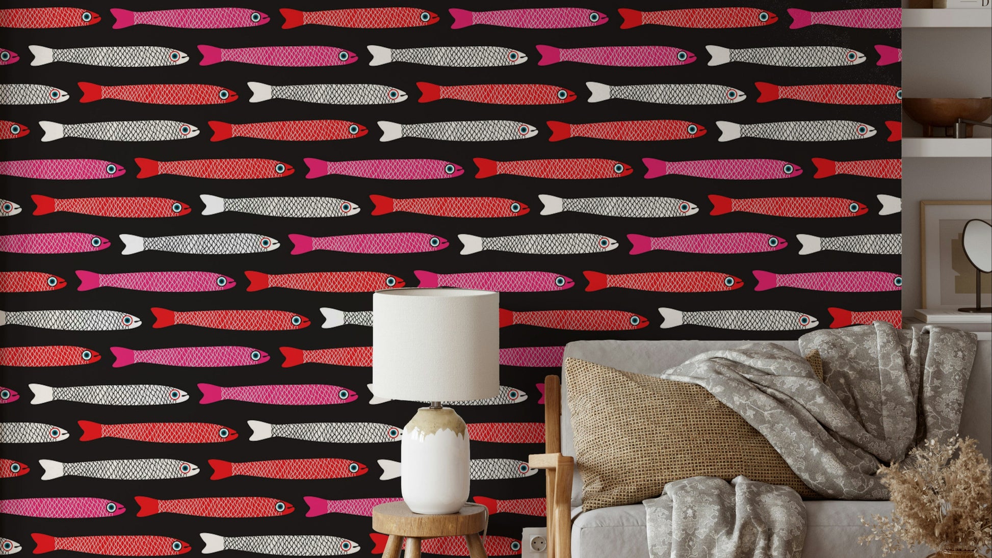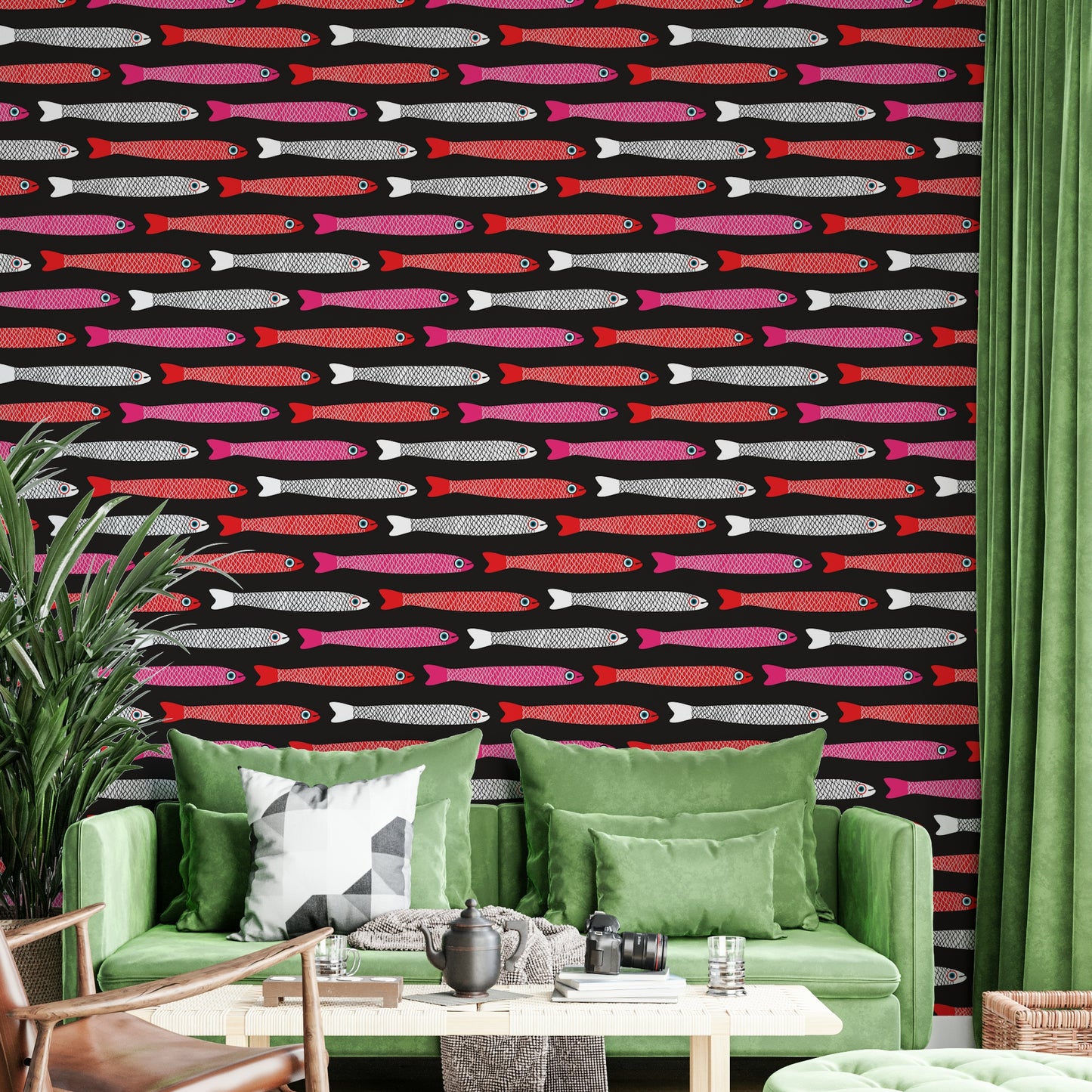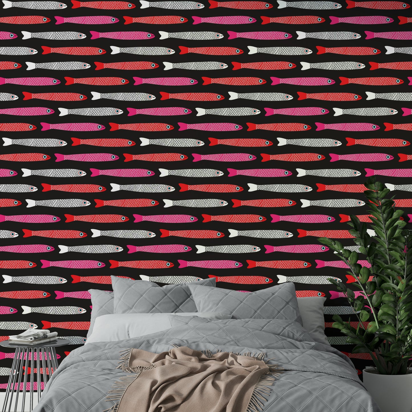 Dive into a graphic whimsical world with this Anchovies wallpaper, featuring a school of stylized fish in vibrant shades of red, delightful fuchsia hot pink, and crisp white on a bold charcoal black background. Each fish is rendered in a charming retro style, creating a visually striking and playful design. This repeating pattern is eye-catching and dramatic without being overwhelming, making it a perfect choice for adding a touch of quirky sophistication to your walls. Let these retro anchovies add a splash of bold color and vintage charm to your daily life! This pattern design is also available in Other Colourways AND in a wall mural version too! Original wallpaper pattern design by Jackie Tahara of UnBlink Studio.