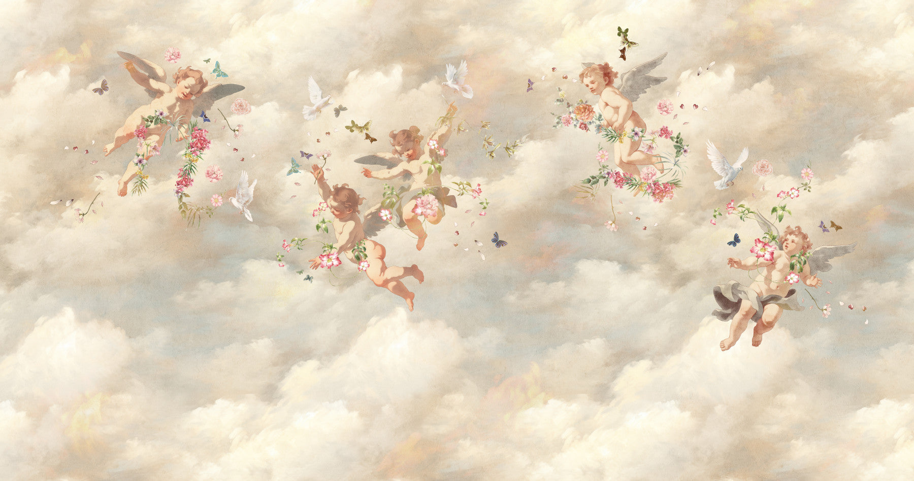 Float away with this enchanting cherub-themed wallpaper for walls. This design features delicate angels, doves, and butterflies amidst soft, cloud-like formations. The artwork blends a classic aesthetic with muted pinks and beiges, bringing a serene and graceful atmosphere to any room. Ideal for a nursery, bedroom, or living room, this beautiful wallpaper complements interiors with a touch of ethereal charm, creating a space that inspires peace and wonder.