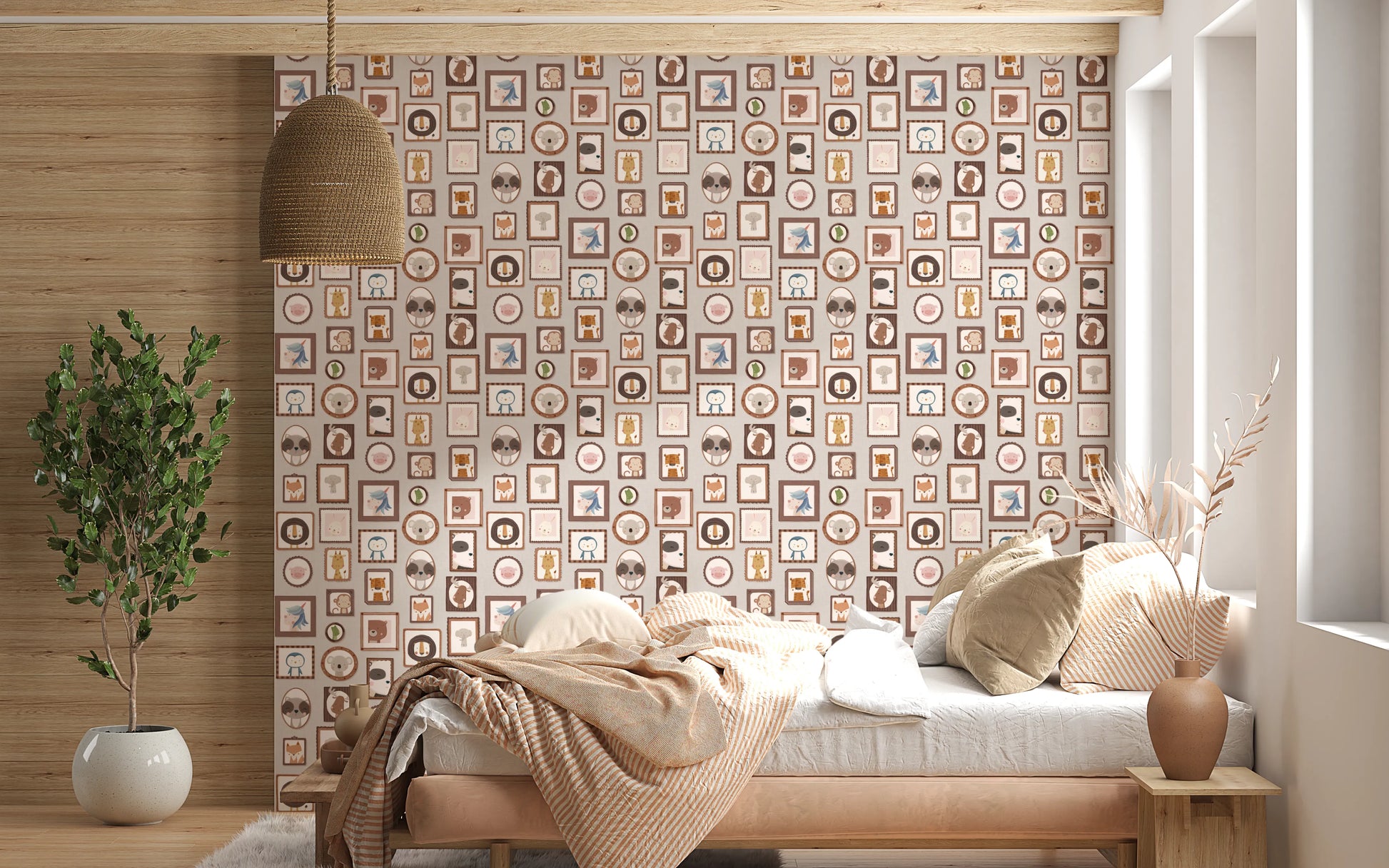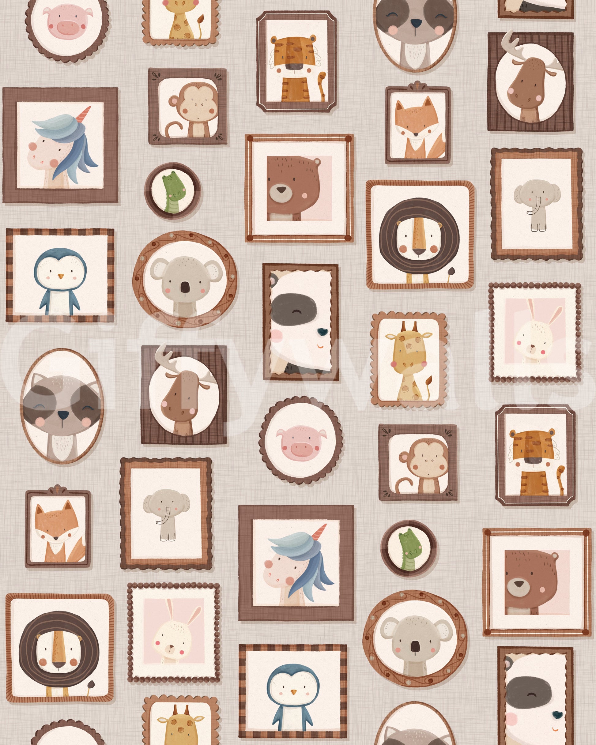 Create a whimsical and heartwarming gallery directly on your walls with this delightful wallpaper for walls. The pattern showcases a series of endearing animal illustrations, lovingly displayed in a variety of decorative frames. The soft browns, creams, and subtle pastel hues evoke a cozy and welcoming ambiance. This design transforms any room into a cheerful sanctuary, making it ideal for children's spaces, playrooms, or even a charming home office. The detailed artwork and engaging characters add personality and invite imagination into your interior space. Let this animal gallery bring smiles to everyone who enters the room.