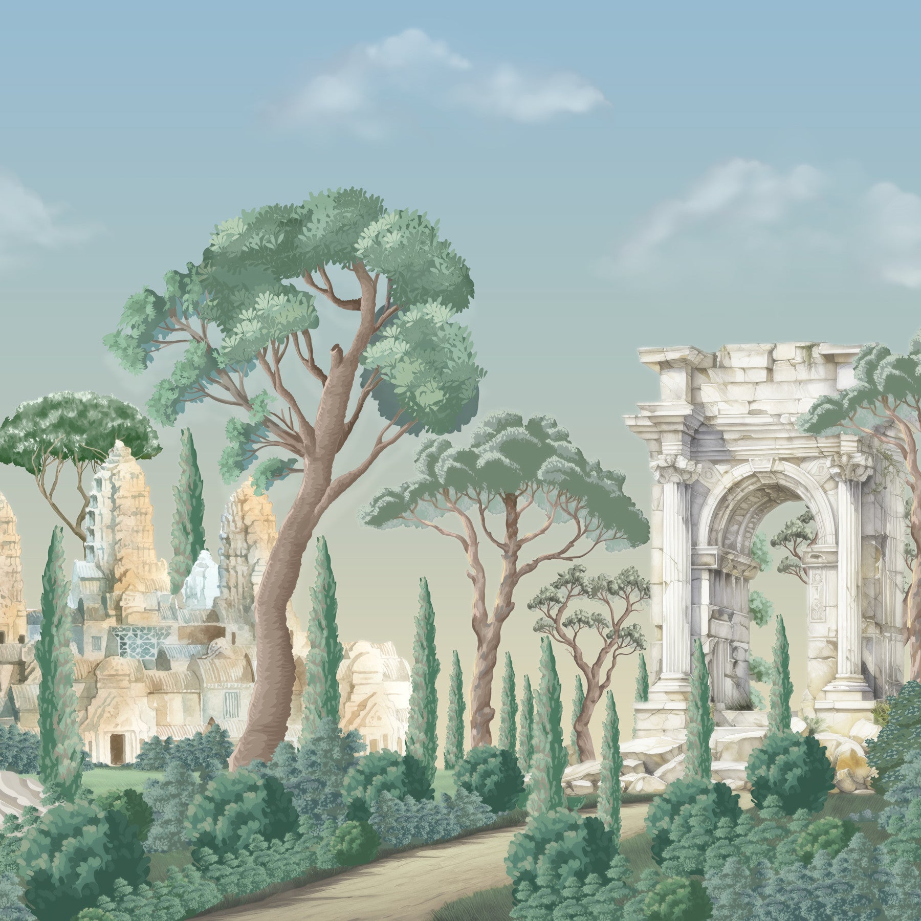 Step into a world of ancient wonder with the Antique Arch & Temple Wallpaper Mural. This exquisite design brings classical architecture to life, featuring majestic stone arches, timeworn temples, and sculpted columns nestled among lush greenery and sky-kissed trees. The soft, painterly style evokes the romance of bygone eras, perfect for creating a refined, timeless ambiance in any room. Ideal for living spaces, studies, or hallways, this mural adds depth and a touch of historical grandeur to your walls. Let your home tell a story of ancient elegance and enduring beauty with this sophisticated wallpaper masterpiece.