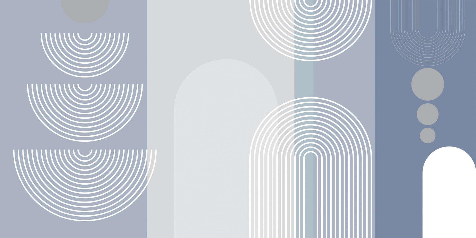 This wallpaper for walls presents a modern abstract pattern with geometric shapes. Arcs and circles combine with soft hues of gray and blue. This design adds visual interest and a calm vibe to a room. Ideal for a living room or bedroom, it complements both minimalist and Scandinavian interiors. It also brightens hallways and entryways.