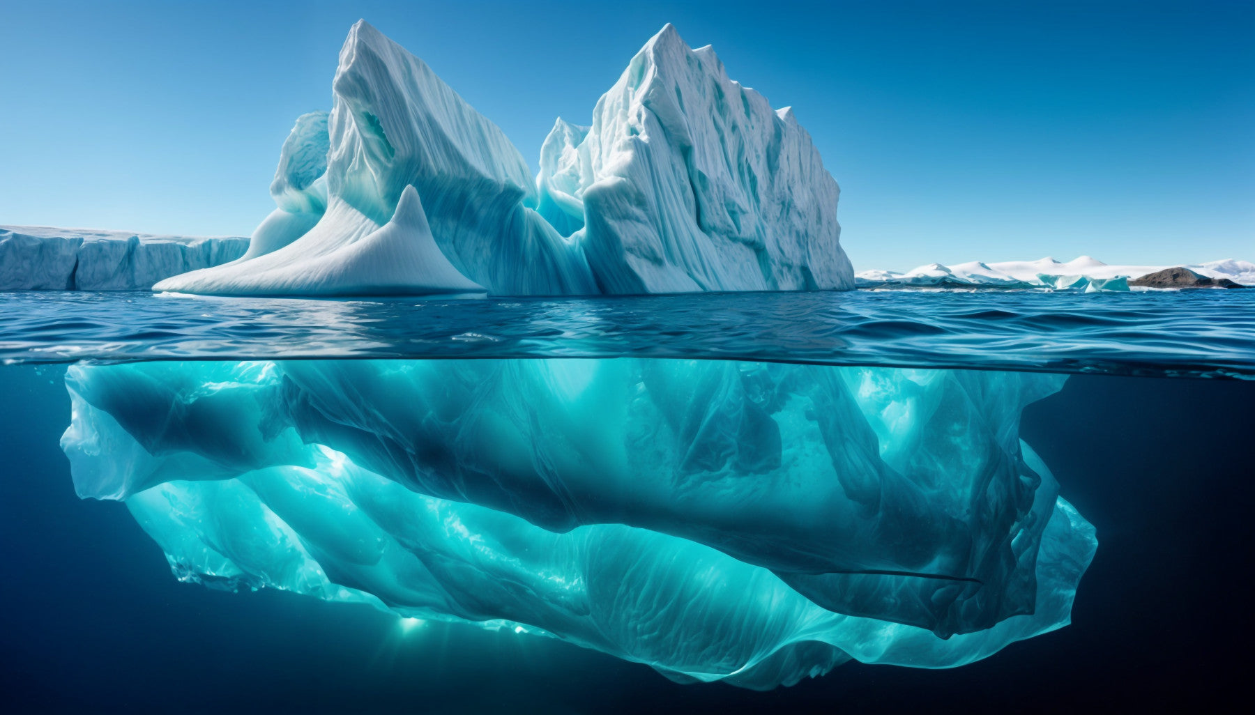 This impressive wallpaper for walls showcases an iceberg split between two worlds, revealing a hidden underwater landscape. The stark white peaks contrast beautifully with the serene blues of the water, creating a visually striking image. This design adds a touch of the Arctic's grandeur to any space. It works wonders in living rooms, studies, or even bedrooms, bringing a refreshing sense of tranquility and wonder to interiors. Its clean lines and cool color palette effortlessly complement minimalist or modern designs.