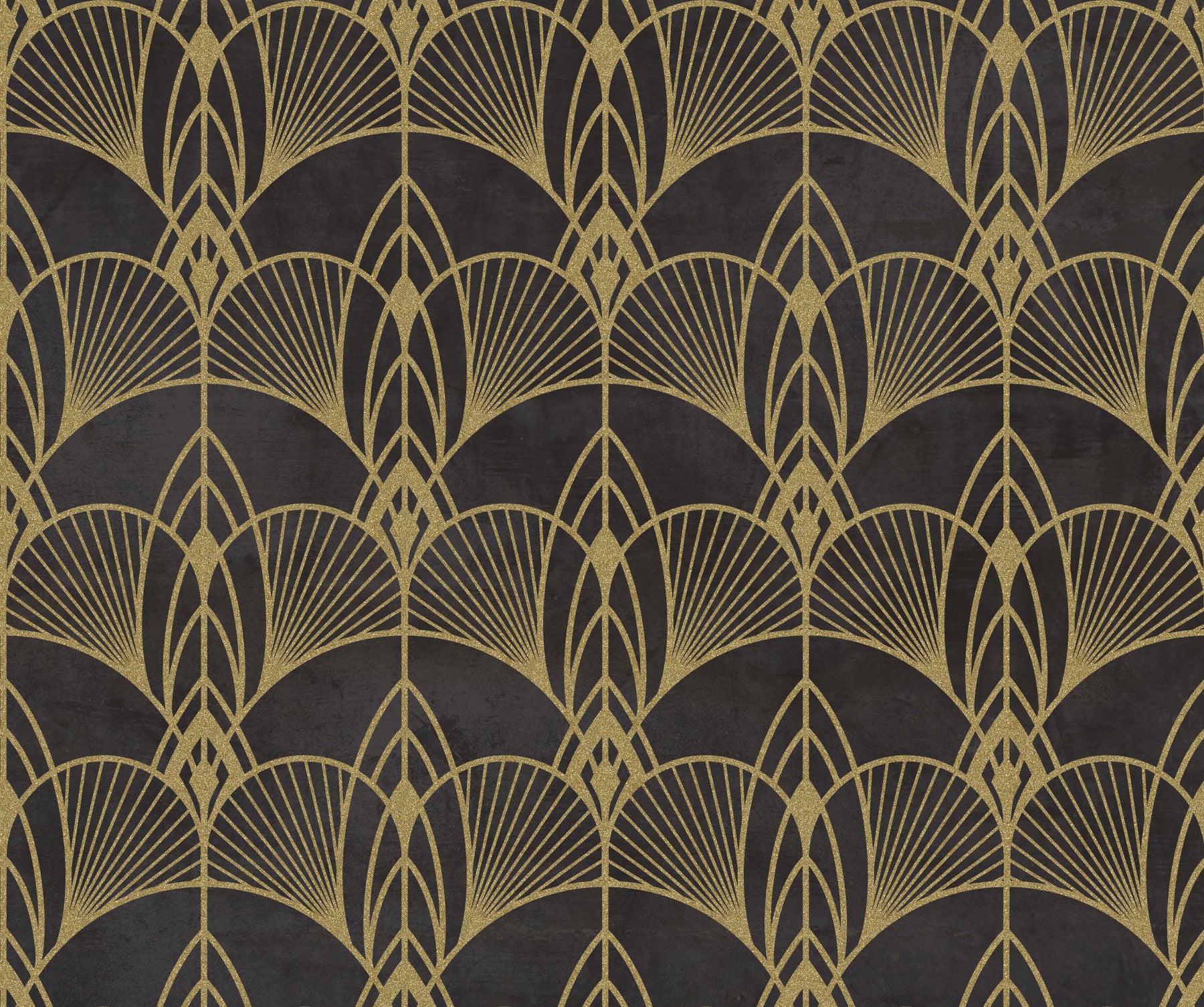 Step into an era of opulent elegance with Art Deco Black Glamour a wallpaper design that embodies the spirit of the roaring twenties. This captivating pattern features shimmering gold, reminiscent of luxurious champagne bubbles, intricately arranged against a deep, concrete black backdrop. The iconic Art Deco fan motif is repeated in a harmonious rhythm, creating a visually striking and sophisticated statement. Each line is meticulously crafted to evoke a sense of geometric precision and timeless beauty. This wallpaper is perfect for creating a dramatic and glamorous focal point in any room, from a chic living space to a stylish bedroom.