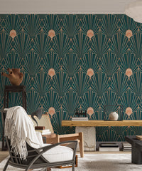 Infuse your space with a touch of modern luxury using this captivating geometric wallpaper. The rich teal backdrop provides a grounding contrast to the shimmering rose gold lines, forming a mesmerizing interplay of shapes and light. The intricate Art Deco-inspired pattern creates a sense of movement and depth, adding a sophisticated touch to any room. This wallpaper seamlessly blends vintage aesthetics with contemporary design principles, perfect for those seeking a unique and visually stunning addition to their home decor. The repeating pattern makes this piece perfect for covering large areas without sacrificing impact.