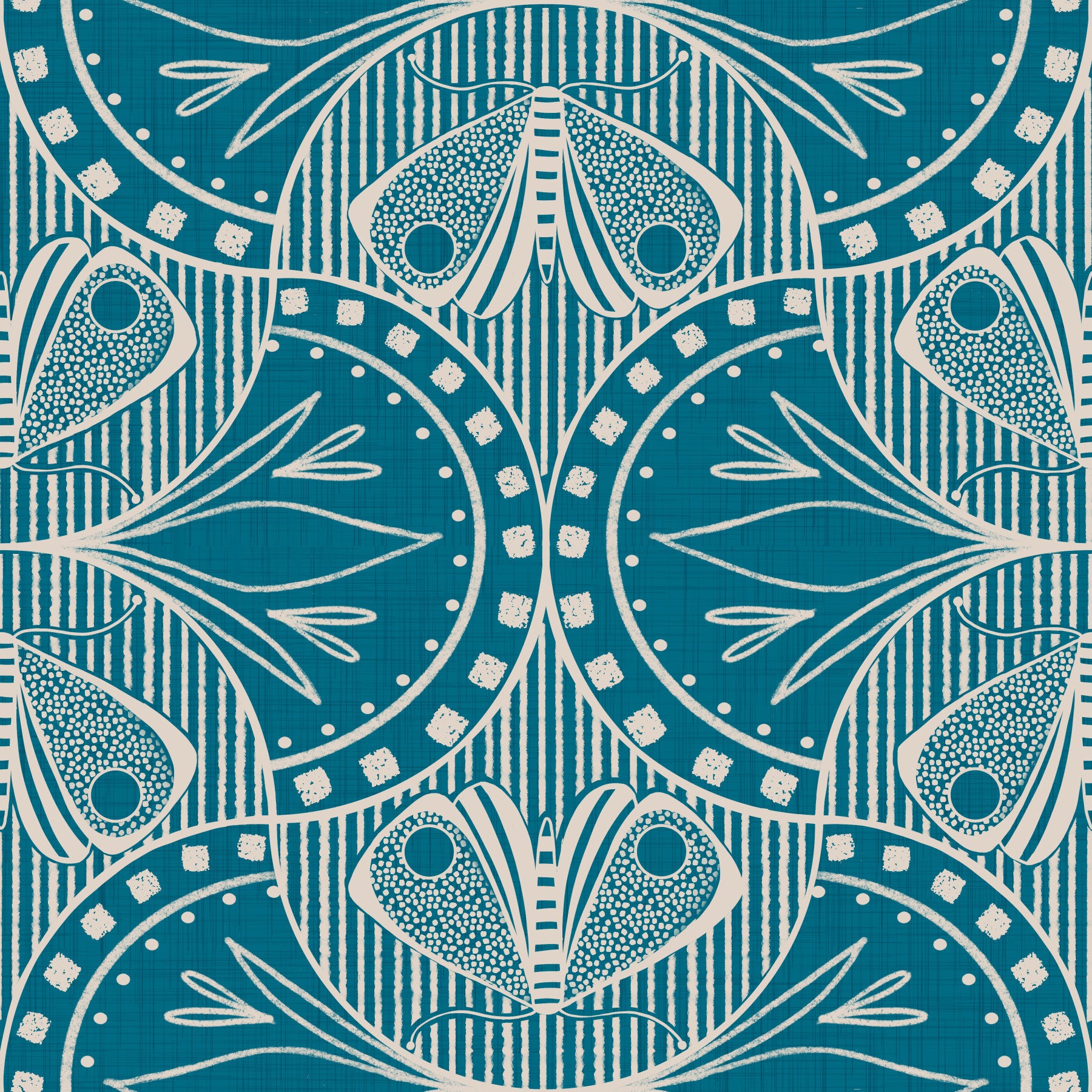 Stylized moth pattern wall mural, rich aquamarine hue, decorative print.
