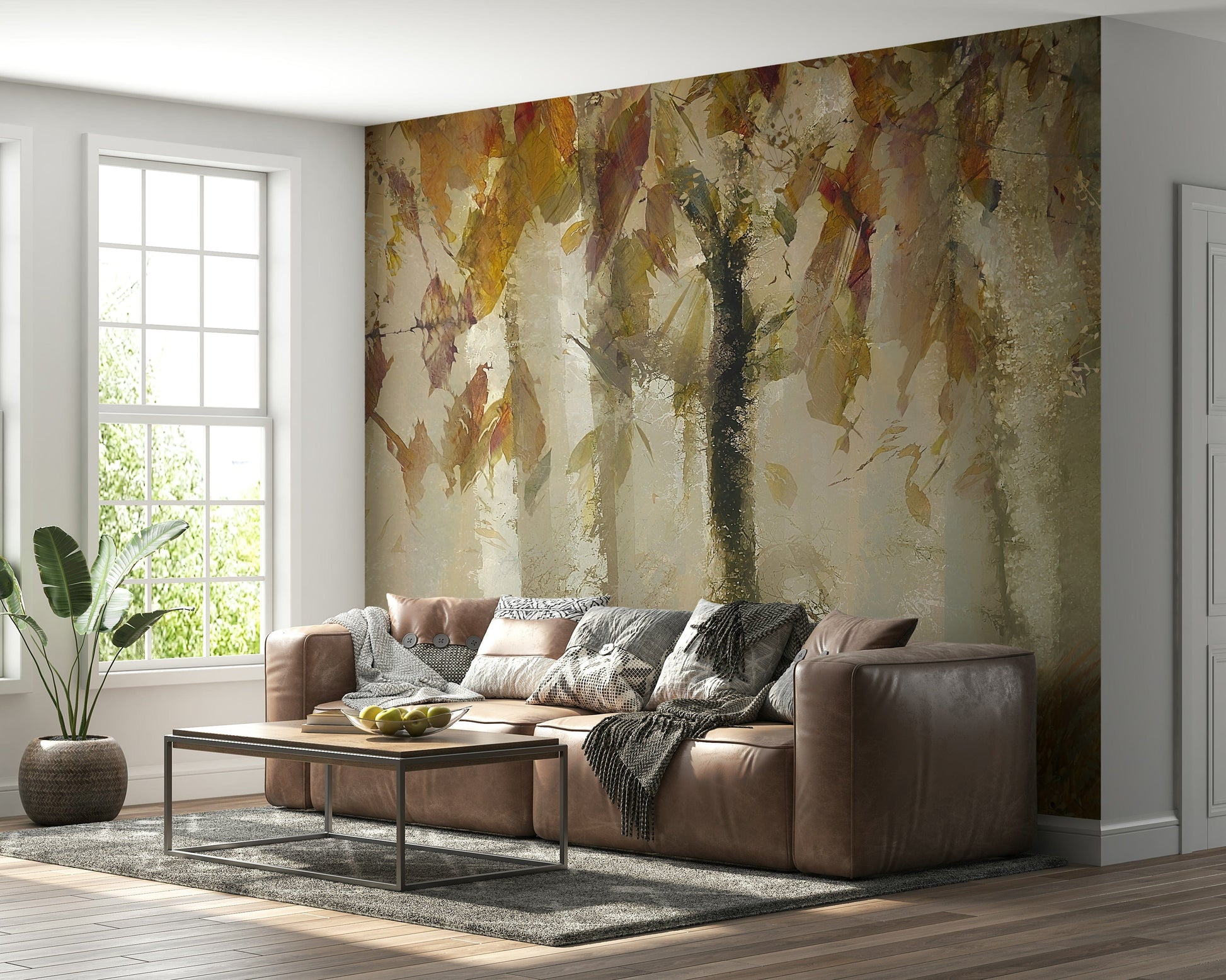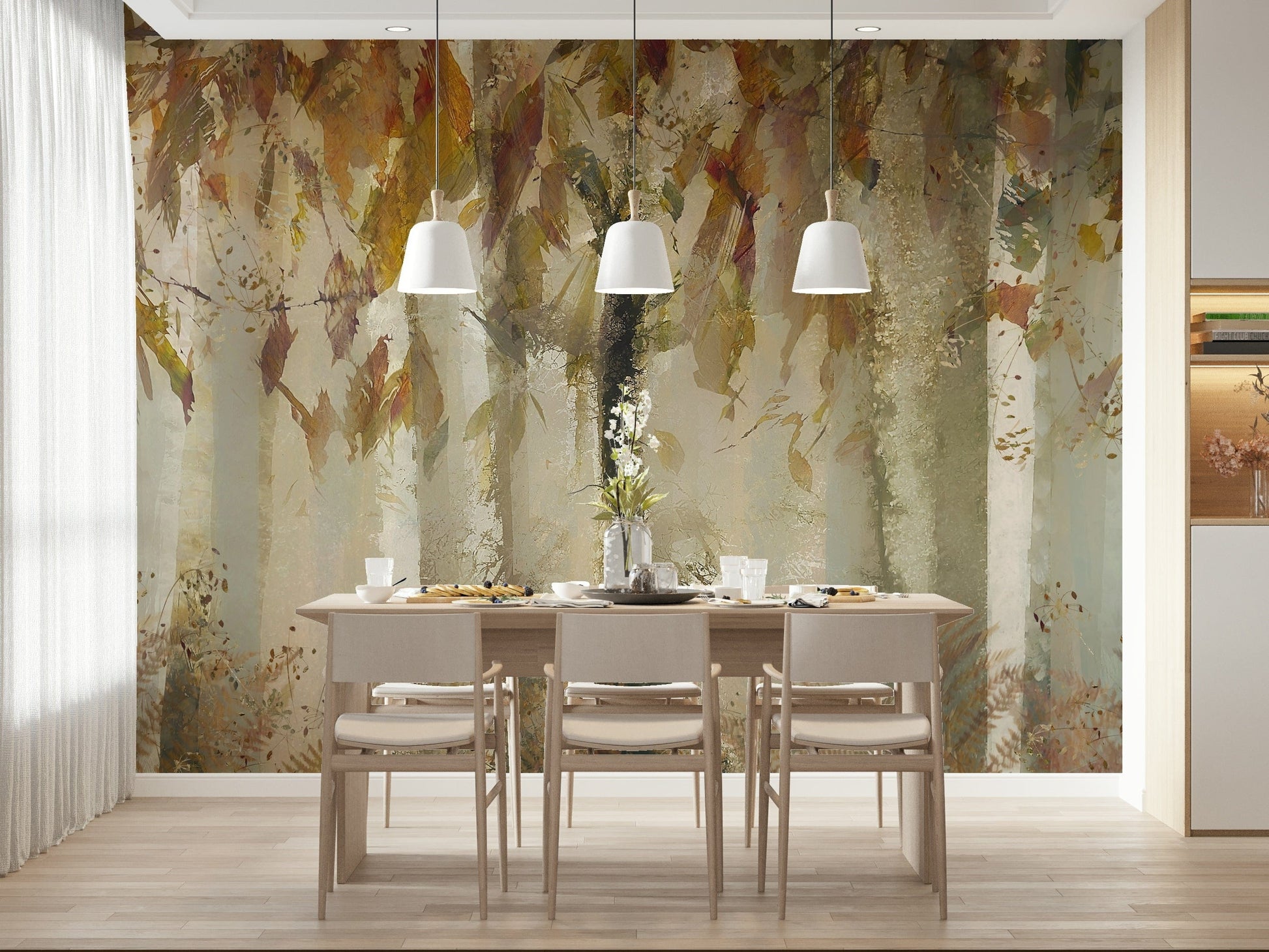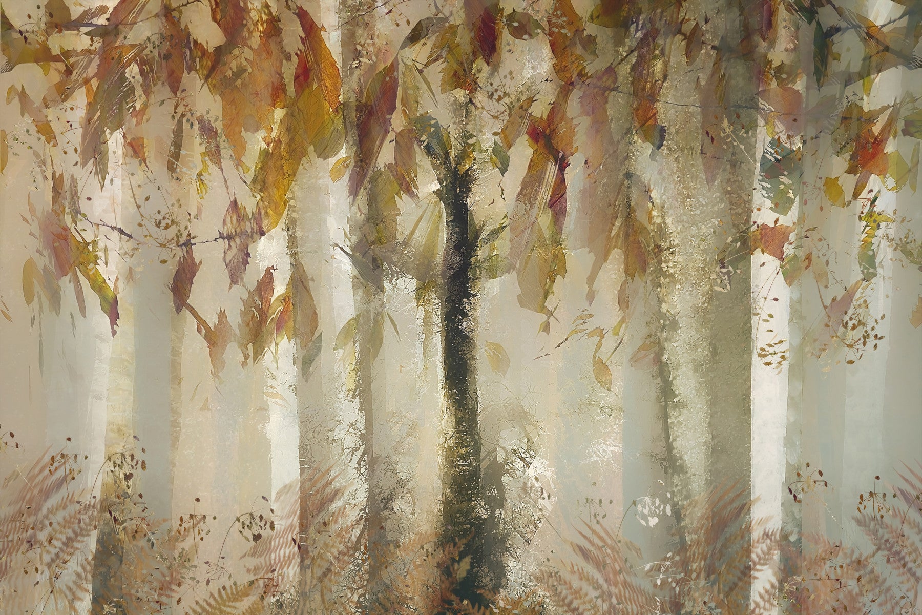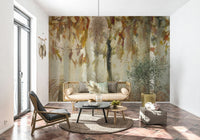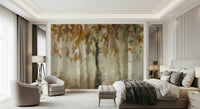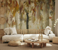 Bring the serene beauty of an autumn forest into your home with this unique design. This wallpaper showcases a canopy of leaves in earthy tones, with a soft, dreamy style. The composition creates a sense of depth. The beige, brown, and muted greens create a peaceful ambiance. Install this wallpaper for walls in living areas or bedrooms to enhance the aesthetic. The pattern is a versatile choice that complements various interior decor themes.
