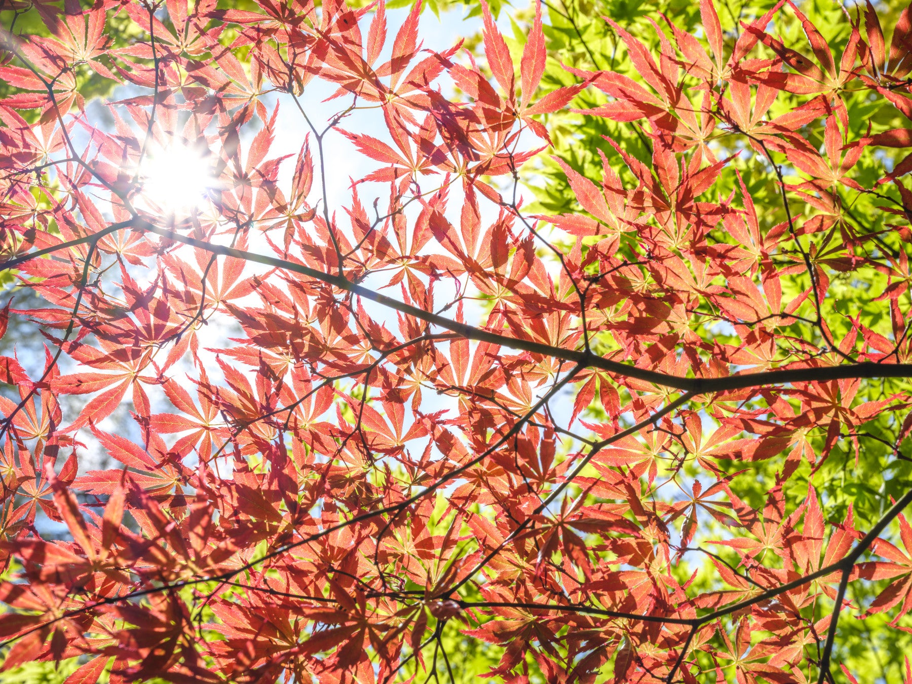 A close-up of the colorful leaves and sunlight.