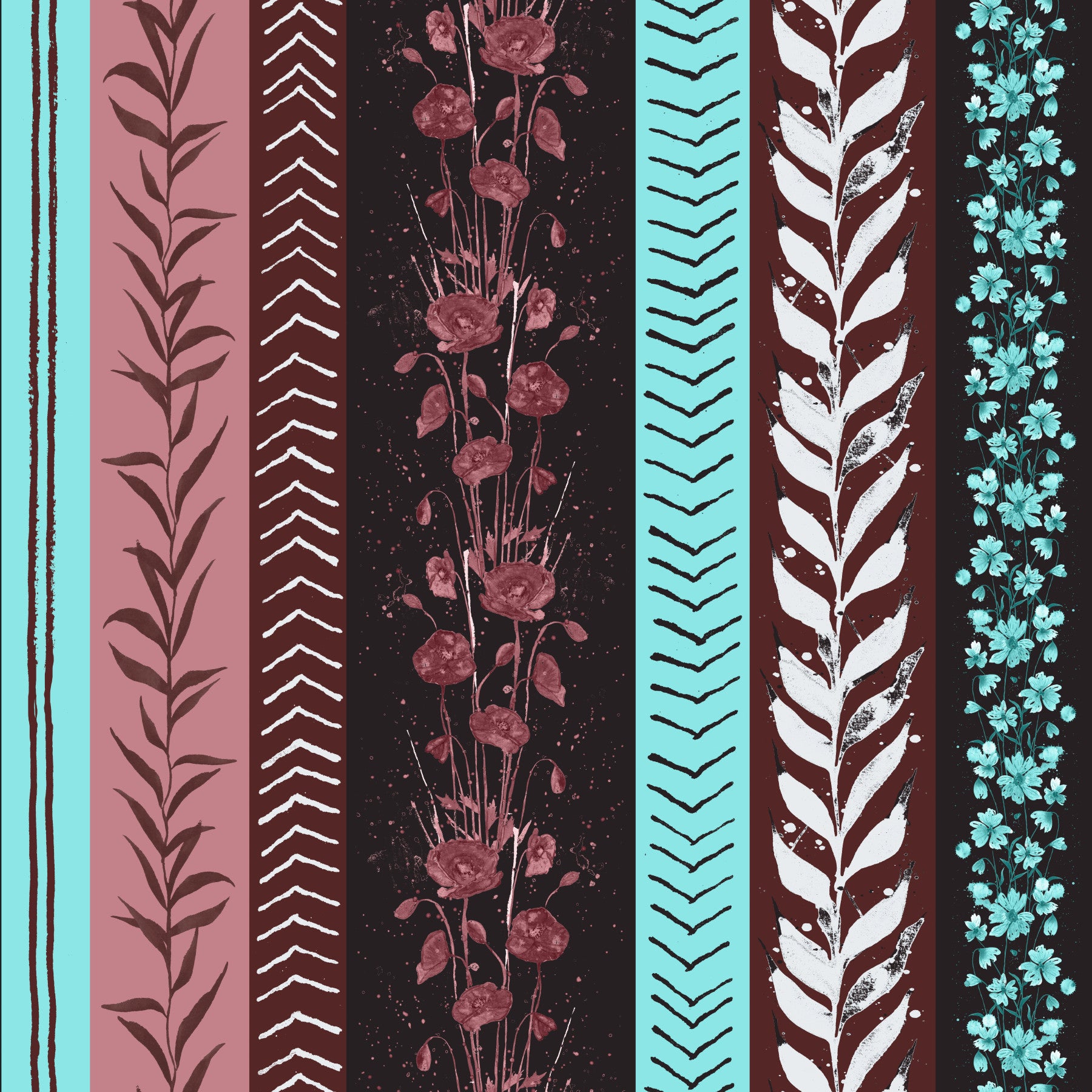 This mural wallpaper is an Autumn Stripes design, a bold wall mural with various patterns in modern red and turquoise tones. It's a great wallpaper for walls for a living room, bedroom, or office. The mix of leaf motifs, abstract arrows, and delicate florals gives your space a vibrant and sophisticated feel. Made from high-quality, durable material, this mural is an easy way to refresh your home decor with a modern, colorful statement.