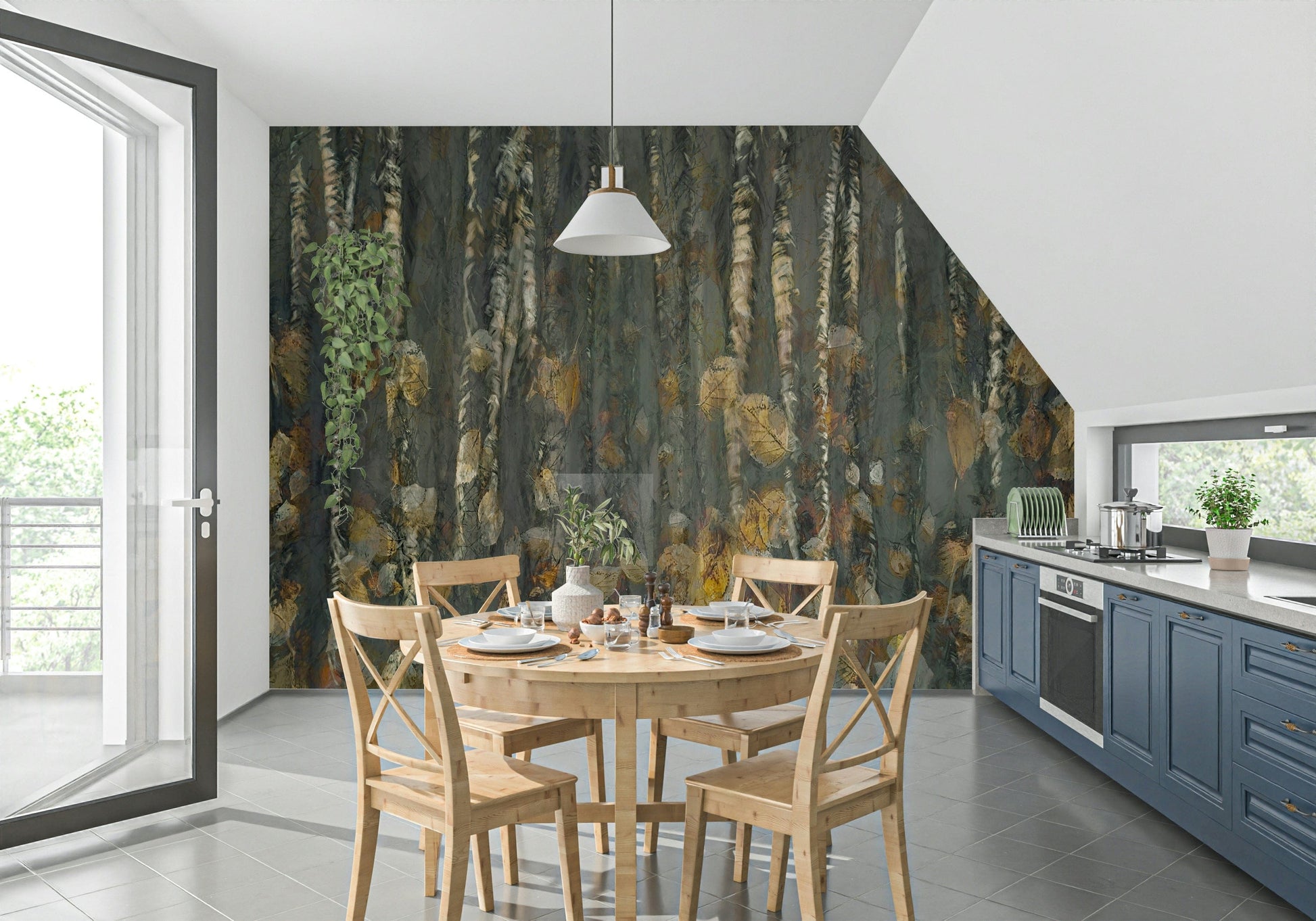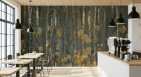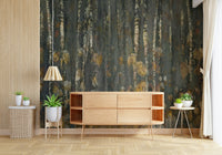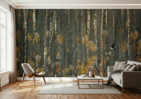 Transform your home with this serene wallpaper for walls, depicting an abstract forest scene. See tree trunks reach upwards. Fallen leaves in warm shades of yellow and brown add a touch of autumnal charm. Ideal for creating a calm and peaceful mood in your living room, bedroom, or hallway, this design pairs nicely with minimalist or rustic decor. The pattern offers visual interest without overwhelming the space.