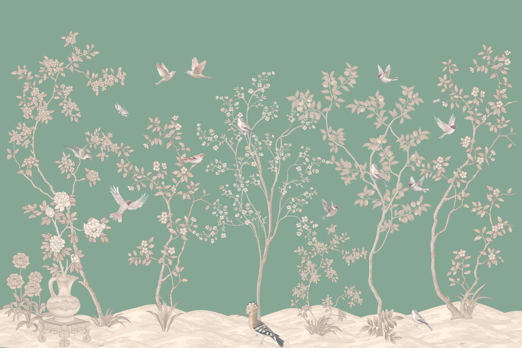 Transform any room with this delightful wallpaper. Trees with delicate flowers and birds bring charm and grace to your home. The understated palette of greens and beiges creates a calming and refined mood. The soft rendering style adds an element of artistic sophistication. This pattern, ideal for the bedroom or living room, works as wallpaper for walls to complement a variety of interior design concepts. It adds subtle interest that doesn't overwhelm and creates a relaxing environment.