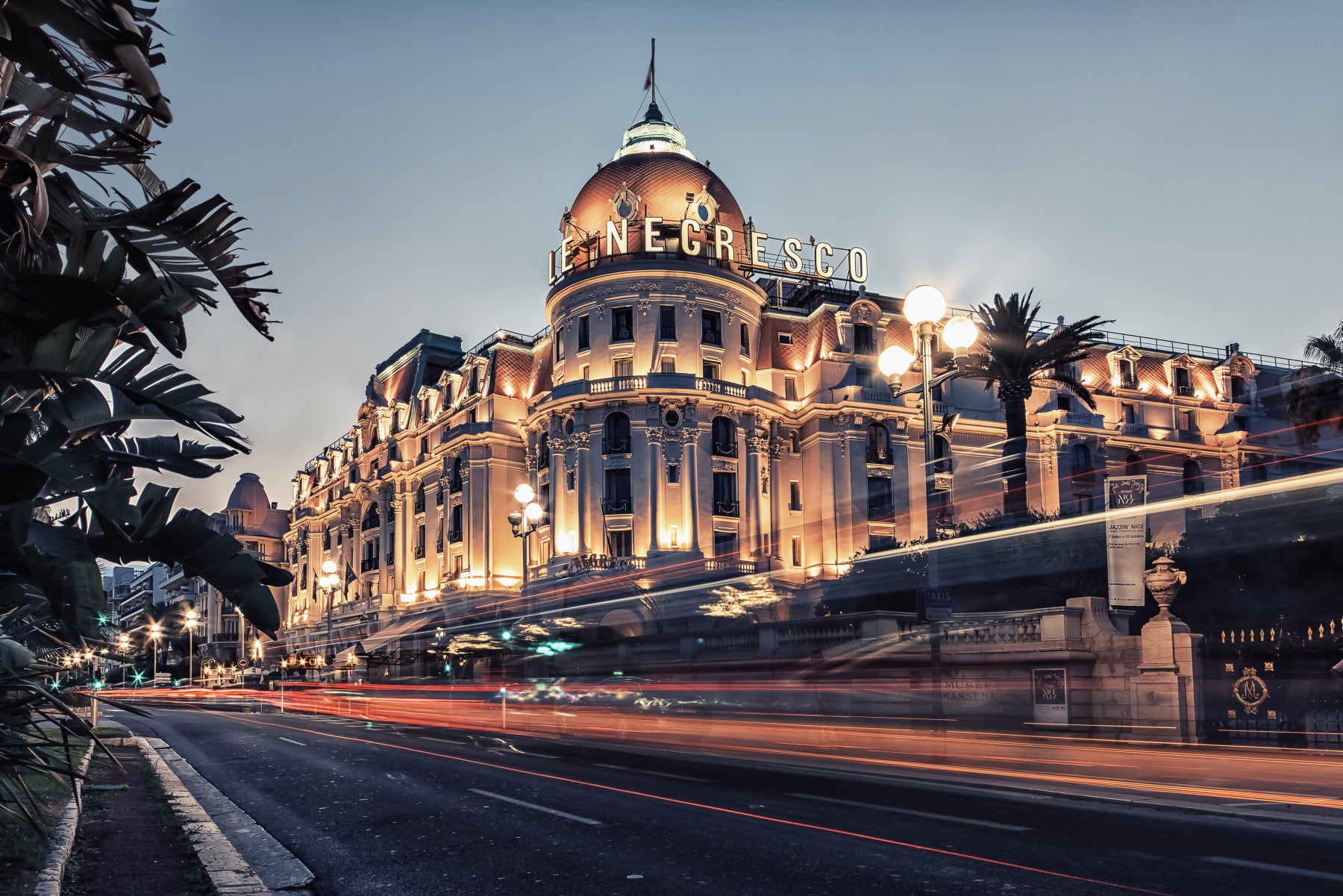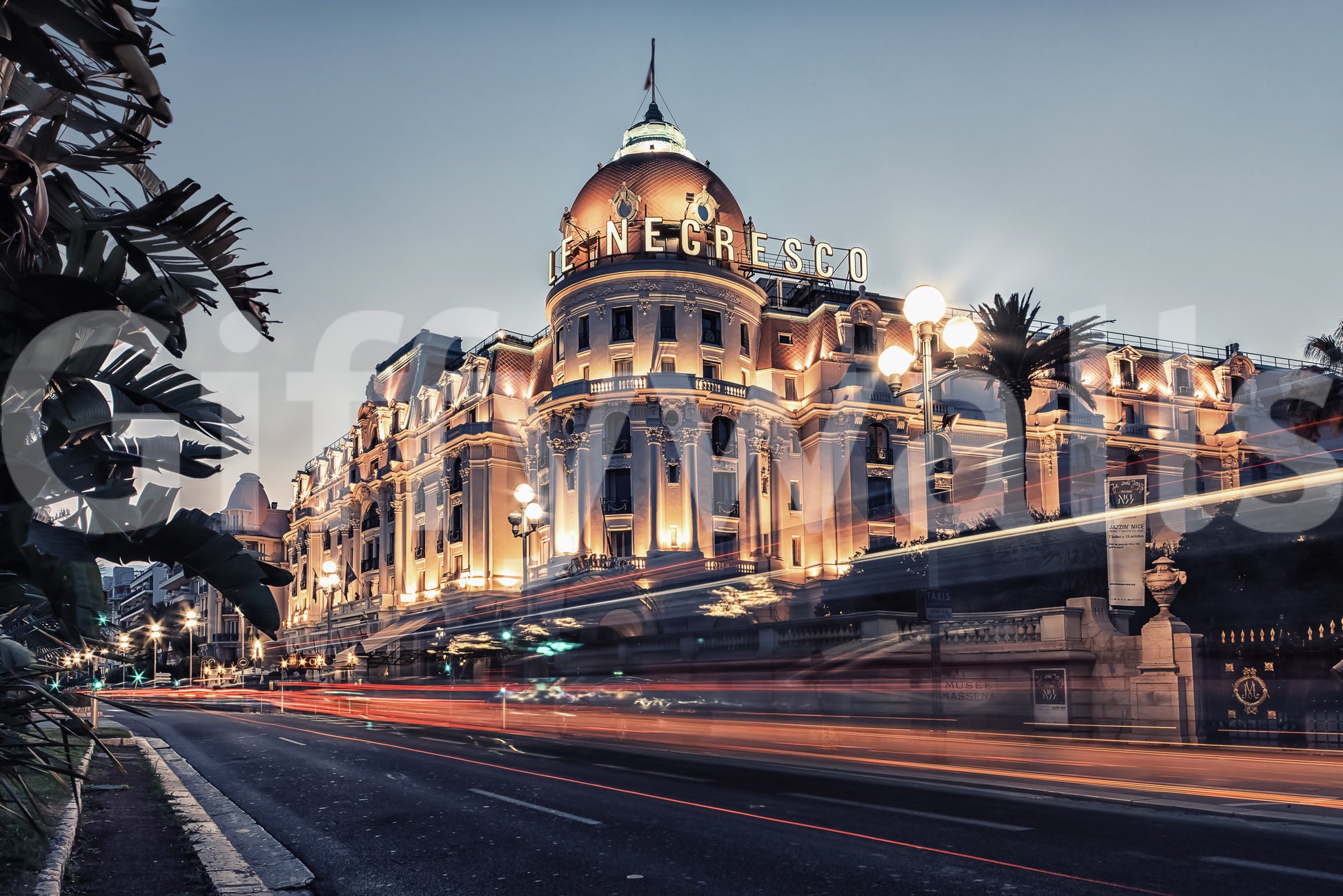 Transform your living spaces with this sophisticated depiction of a Riviera cityscape at twilight. Featuring an iconic building illuminated against the darkening sky, this wallpaper for walls brings a touch of old-world glamour to any room. Streaks of light capture the vibrant energy of the city streets, creating a sense of movement and excitement. The blend of cool blues and warm oranges creates a calming yet elegant atmosphere, ideal for a bedroom, living room, or dining area. Enhance your home with the timeless beauty of the French Riviera.