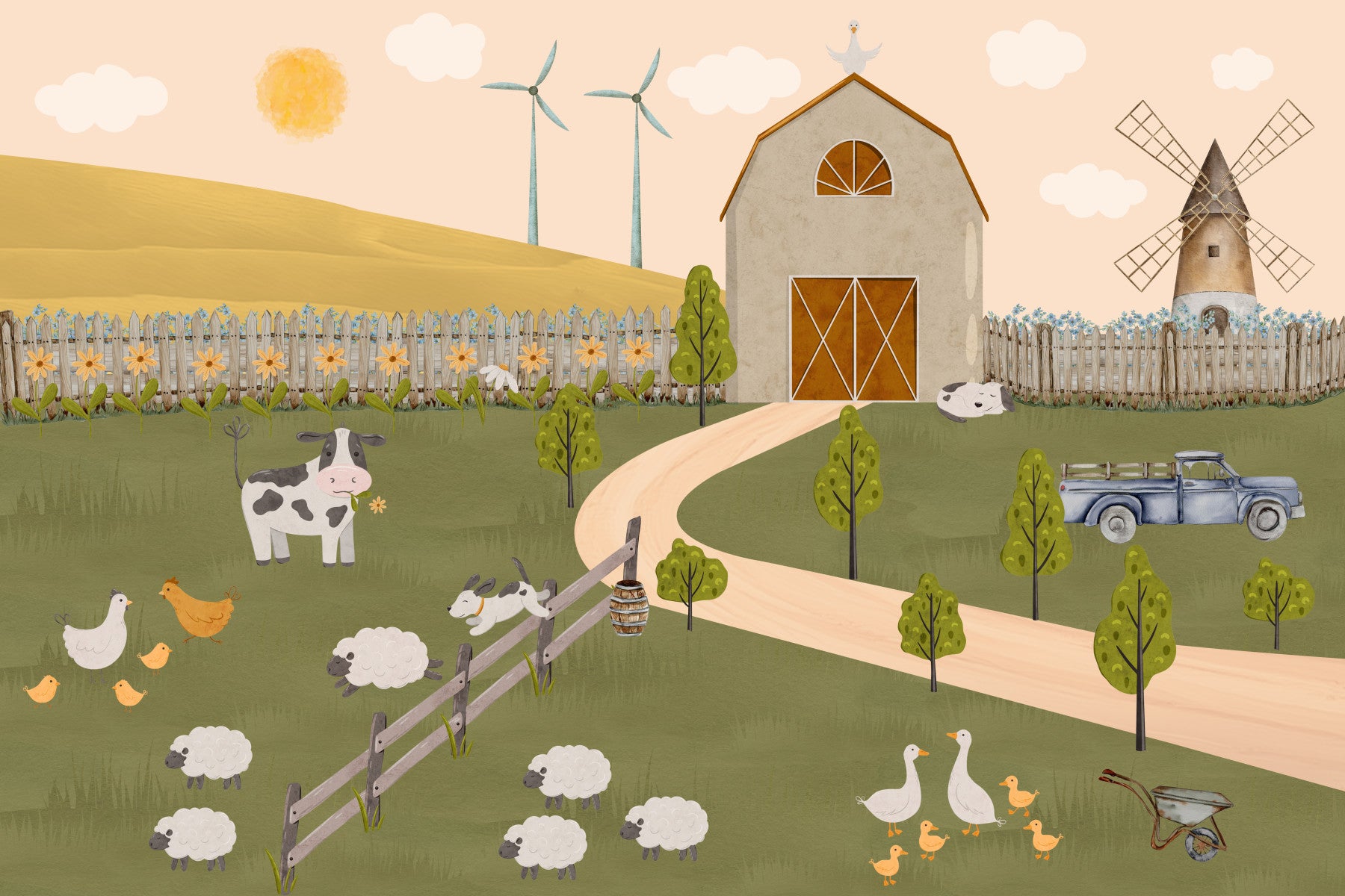 A peaceful wall mural with a whimsical farm scene.