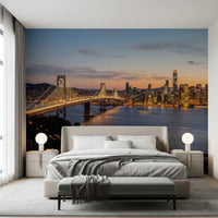 This stunning photographic wallpaper for walls captures the majestic San Francisco Bay at twilight. The iconic Bay Bridge, illuminated with a cascade of golden lights, gracefully spans the serene, deep blue water. Across the bay, the dazzling city skyline glows with a warm, golden radiance, contrasting beautifully with the soft gradient of the dusk sky—from gentle orange hues to deep indigo. This sophisticated design brings urban grandeur and a sense of expansive beauty to your interior. It is perfect for creating a dramatic feature wall in a living room, dining room, or a contemporary home office, transforming your space with its captivating metropolitan charm and vibrant light.