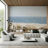 Capture the essence of a tranquil beach day with this detailed wallpaper for walls. The artwork features rippling water, fine sand, and beach grass. Its gentle blend of tans, blues, and neutral hues sets a soothing scene. This wallpaper will look beautiful in the bedroom, living room, or office. It is especially well suited for spaces seeking a relaxed or casual design to complement wooden furnishings and natural light.