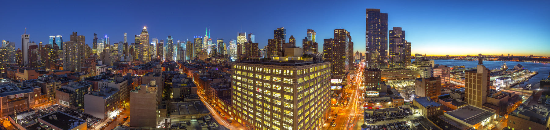 Lower Manhattan cityscape, New York. Transform any space with this breathtaking depiction of the New York City skyline at night. This wallpaper showcases iconic skyscrapers illuminated against a deep blue evening sky. The dynamic composition uses a range of blue hues contrasted with golden light reflections. It works well in a living area, bedroom, or office. This wallpaper for walls brings a sense of grandeur to minimalist spaces and adds depth to contemporary rooms. The detailed cityscape design complements metallic or modern accents.