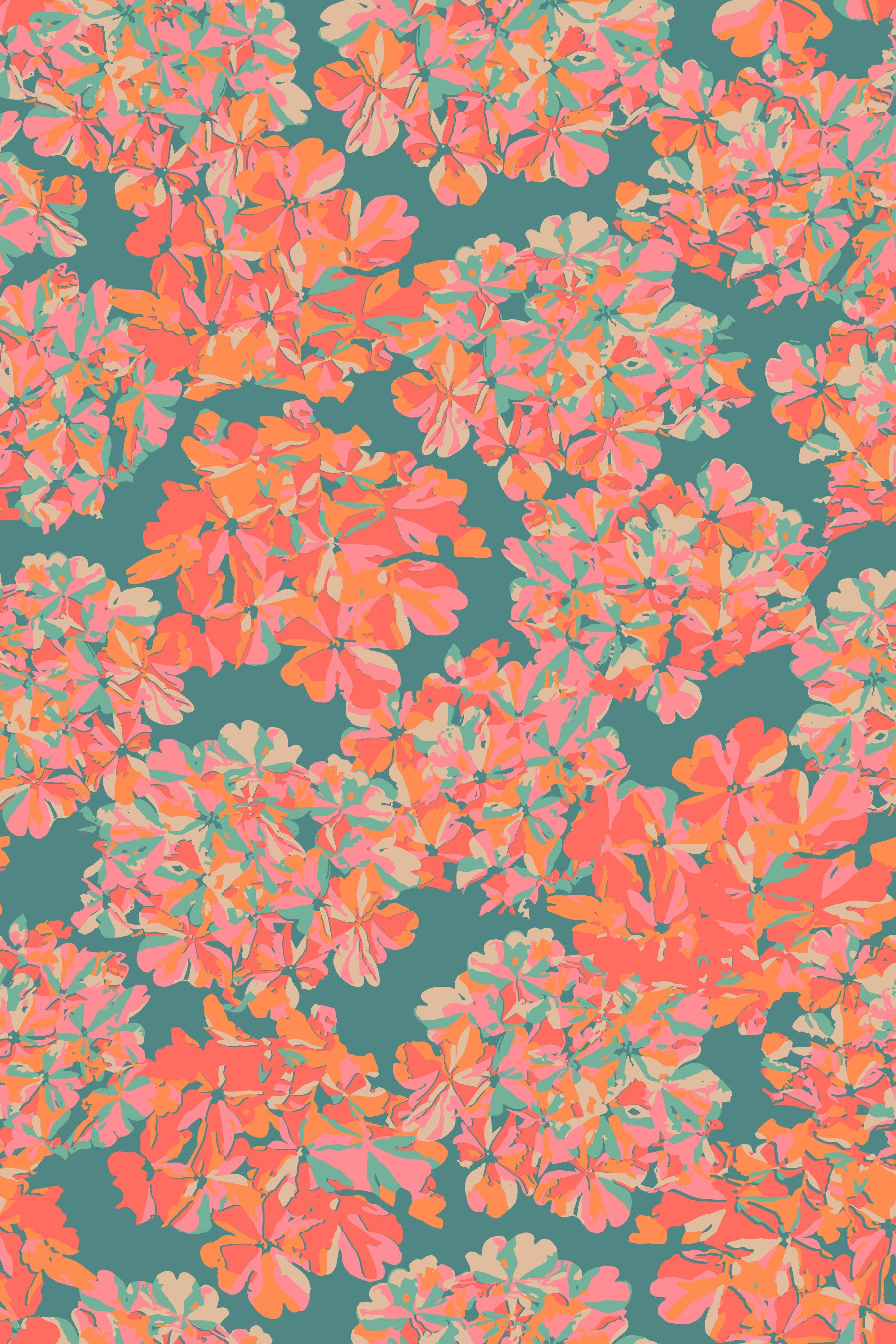 Antique Apricot Teal vivid bloom wallpaper, punchy pink and orange flowers.