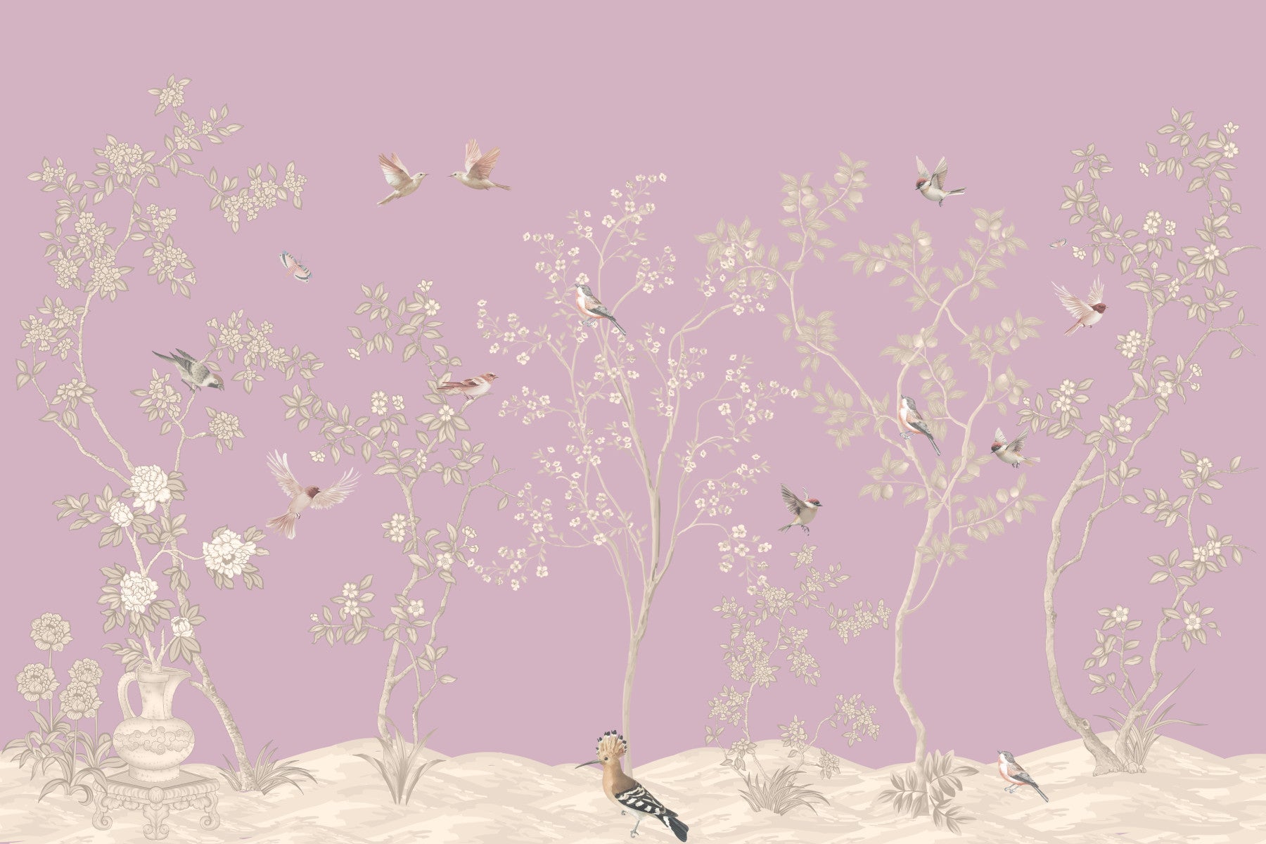 Bring the tranquility of nature indoors with this detailed design. See trees dotted with delicate blossoms and small birds resting on branches or taking flight. A soft mauve backdrop lends a touch of calm. Choose this wallpaper for walls to complement interiors with a serene aesthetic, making it a great choice for a bedroom, living room, or hallway for a look that is both graceful and inviting.