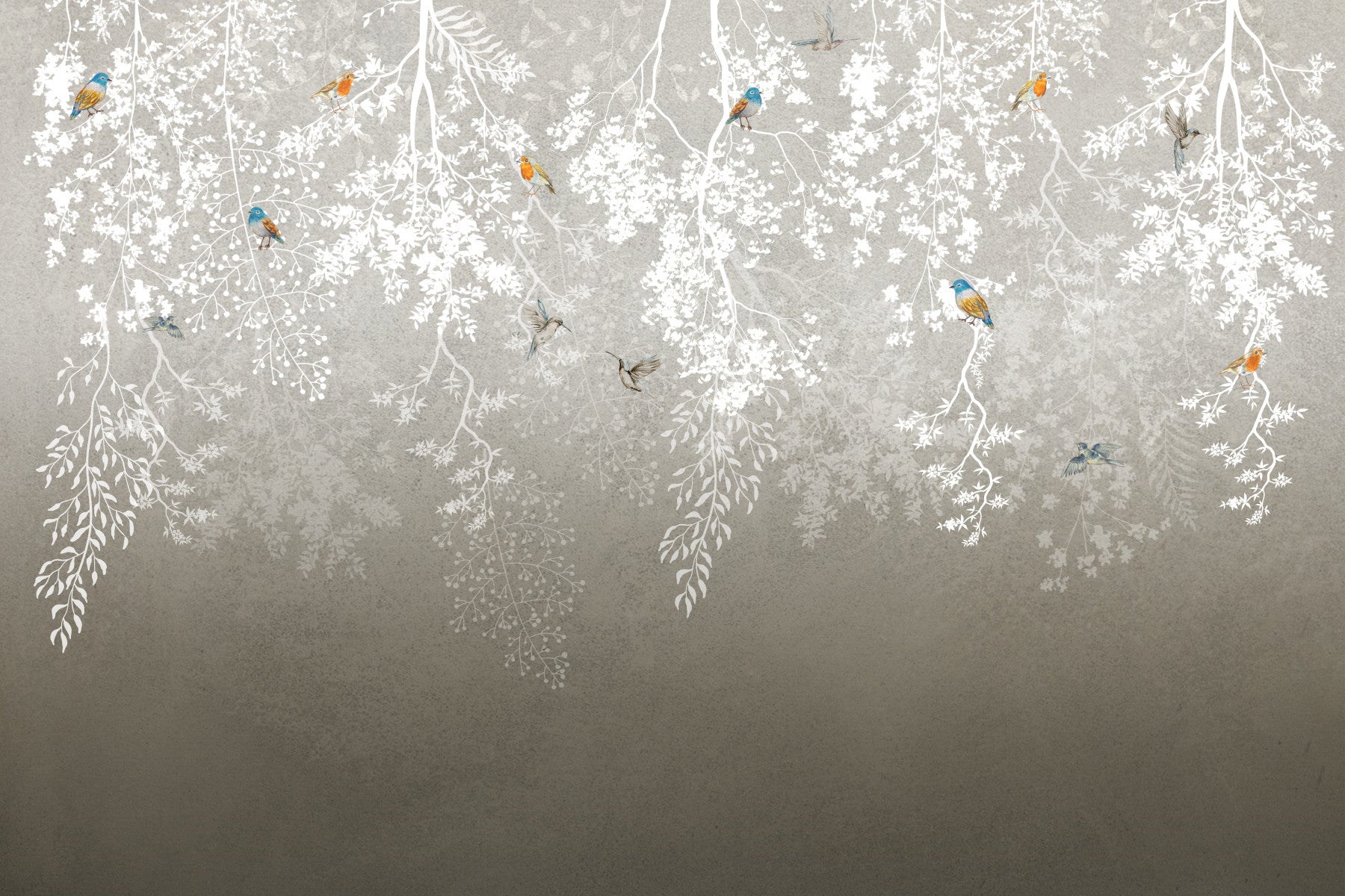 Create a peaceful haven with this exquisite bird and branch design. The delicate illustration dances across a soft gray backdrop, bringing a touch of nature indoors. This sophisticated pattern uses neutral tones alongside pops of color to enhance any room. Use this wallpaper for walls in your bedroom, living area, or hallway to achieve a calming aesthetic. The design complements interiors by adding subtle visual interest without overwhelming the space.