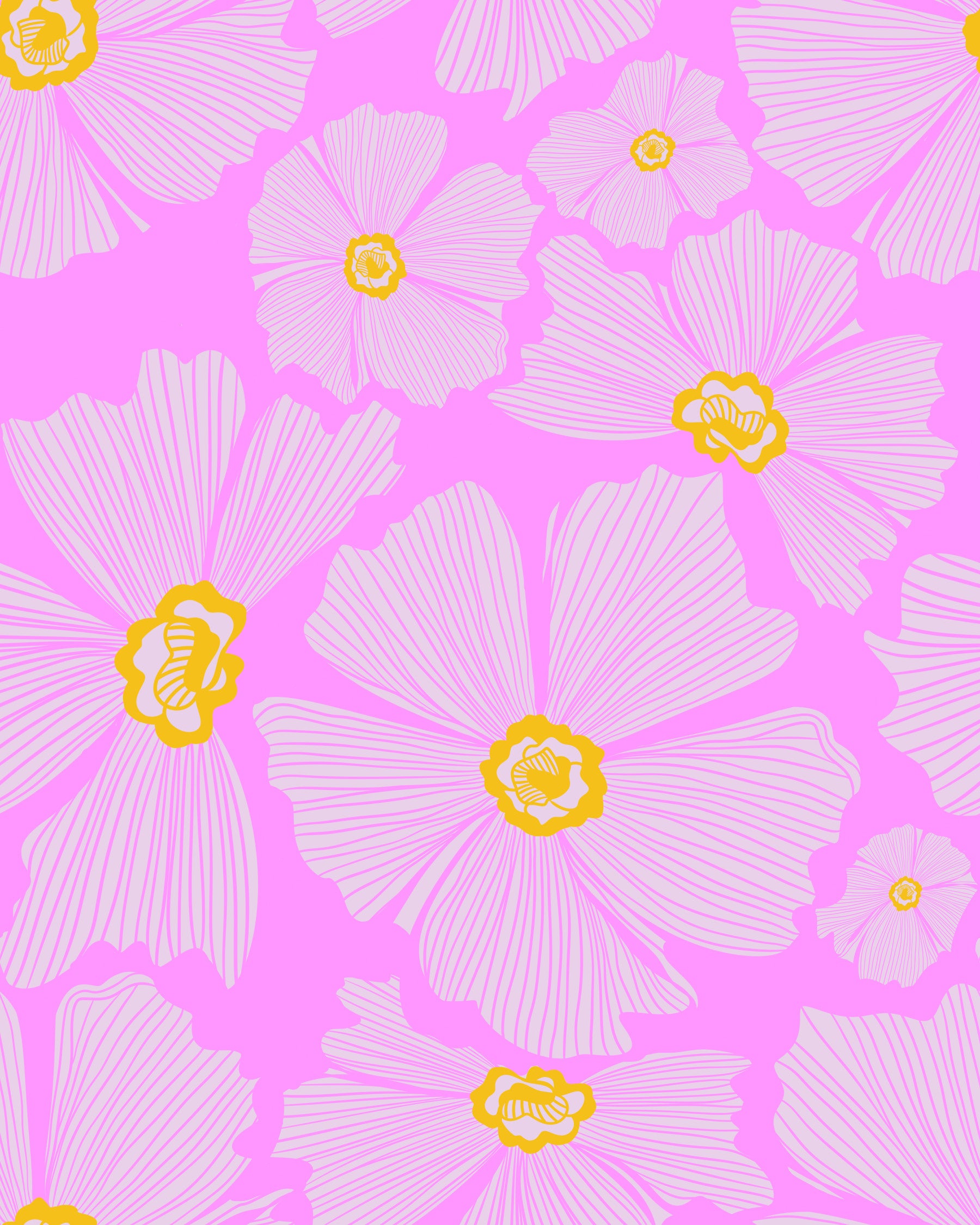 Invite a gentle floral design into your home with this vibrant wallpaper. A joyful array of stylized pink blossoms with warm yellow centers offers a lively spirit. The bright pink backdrop adds a touch of cheer to any space. This wallpaper for walls transforms rooms; consider it for a kids room, bedroom, or anywhere you desire a splash of color and playful elegance. The repeating flower pattern ensures a seamless and visually engaging experience.