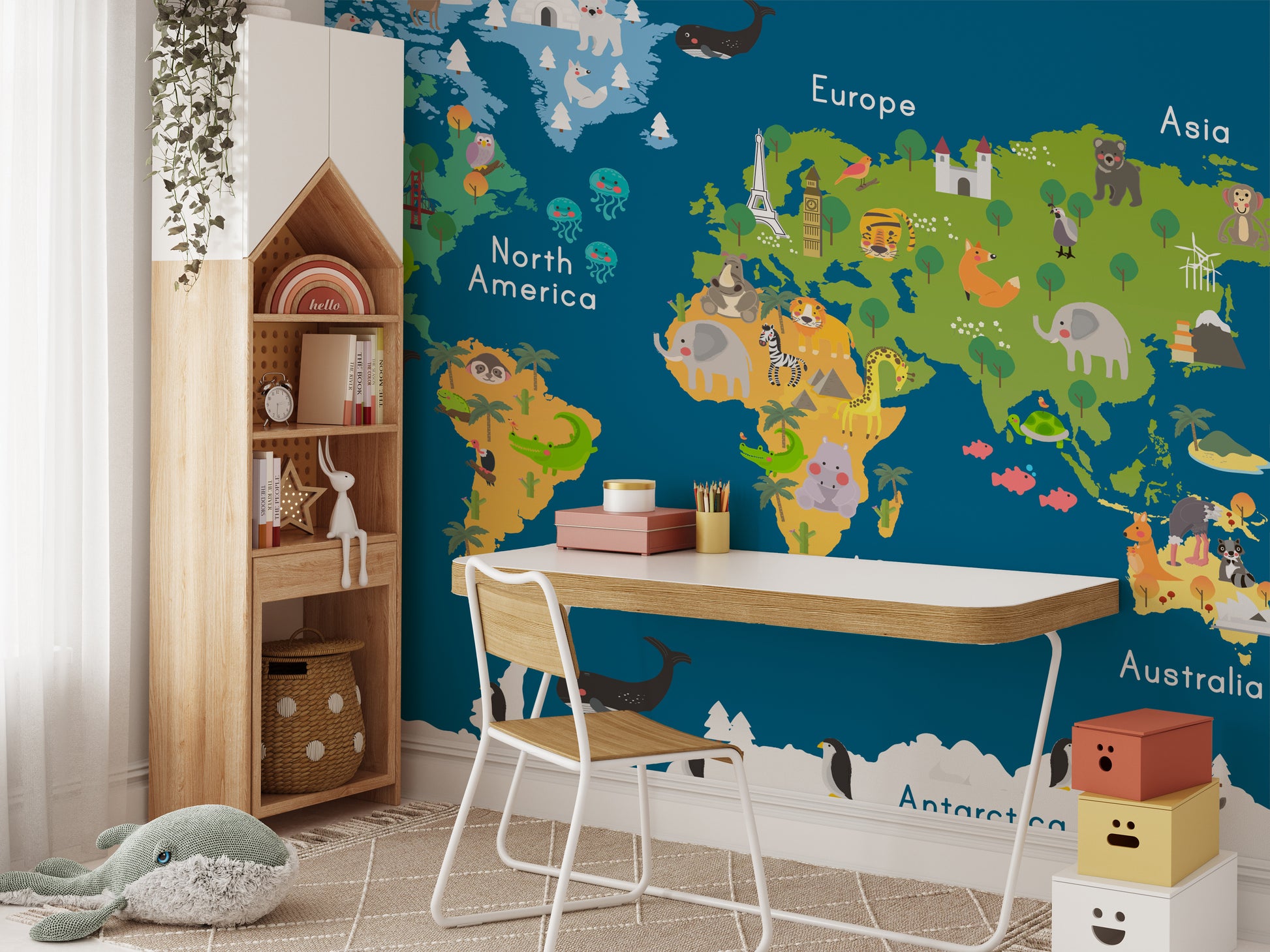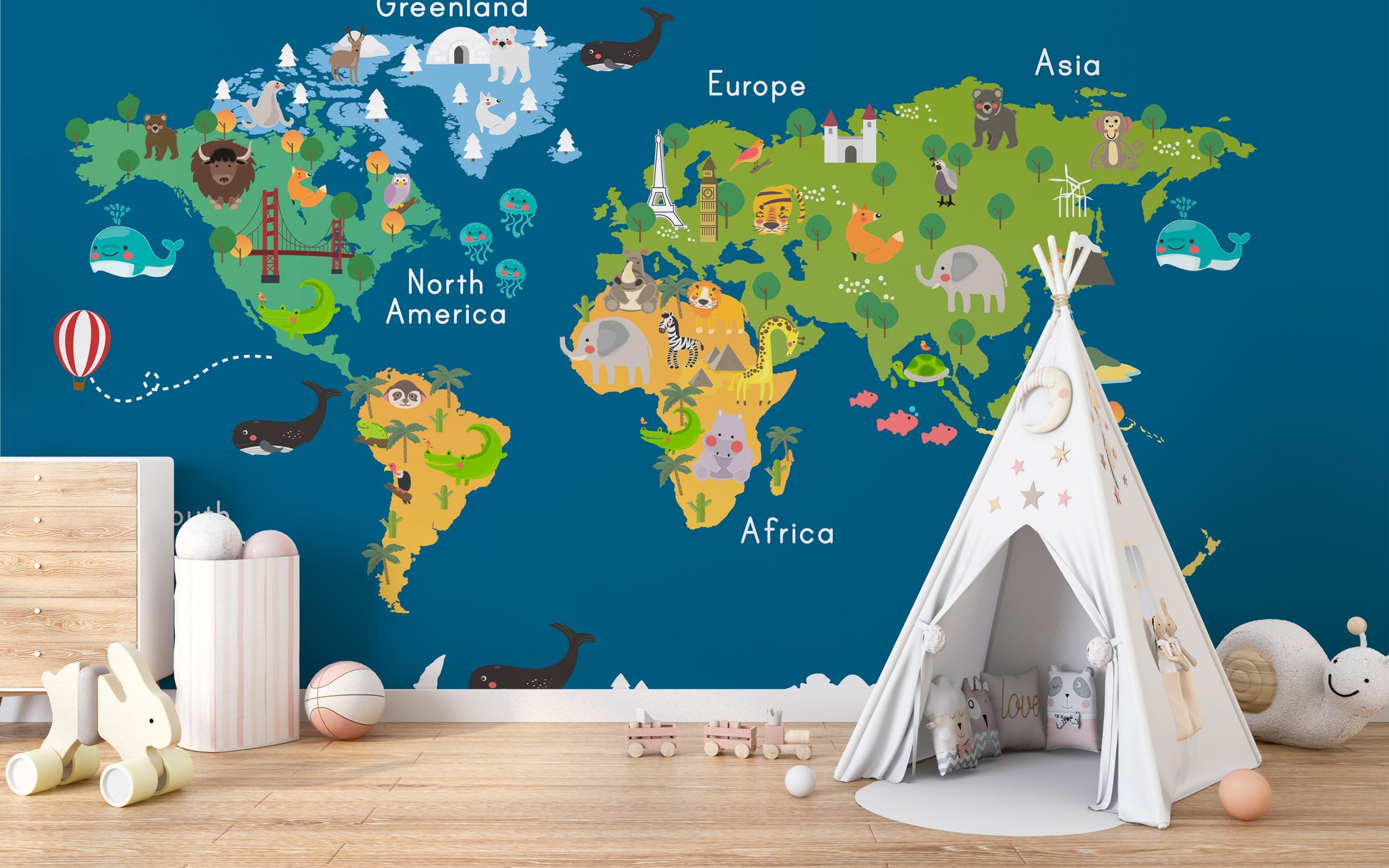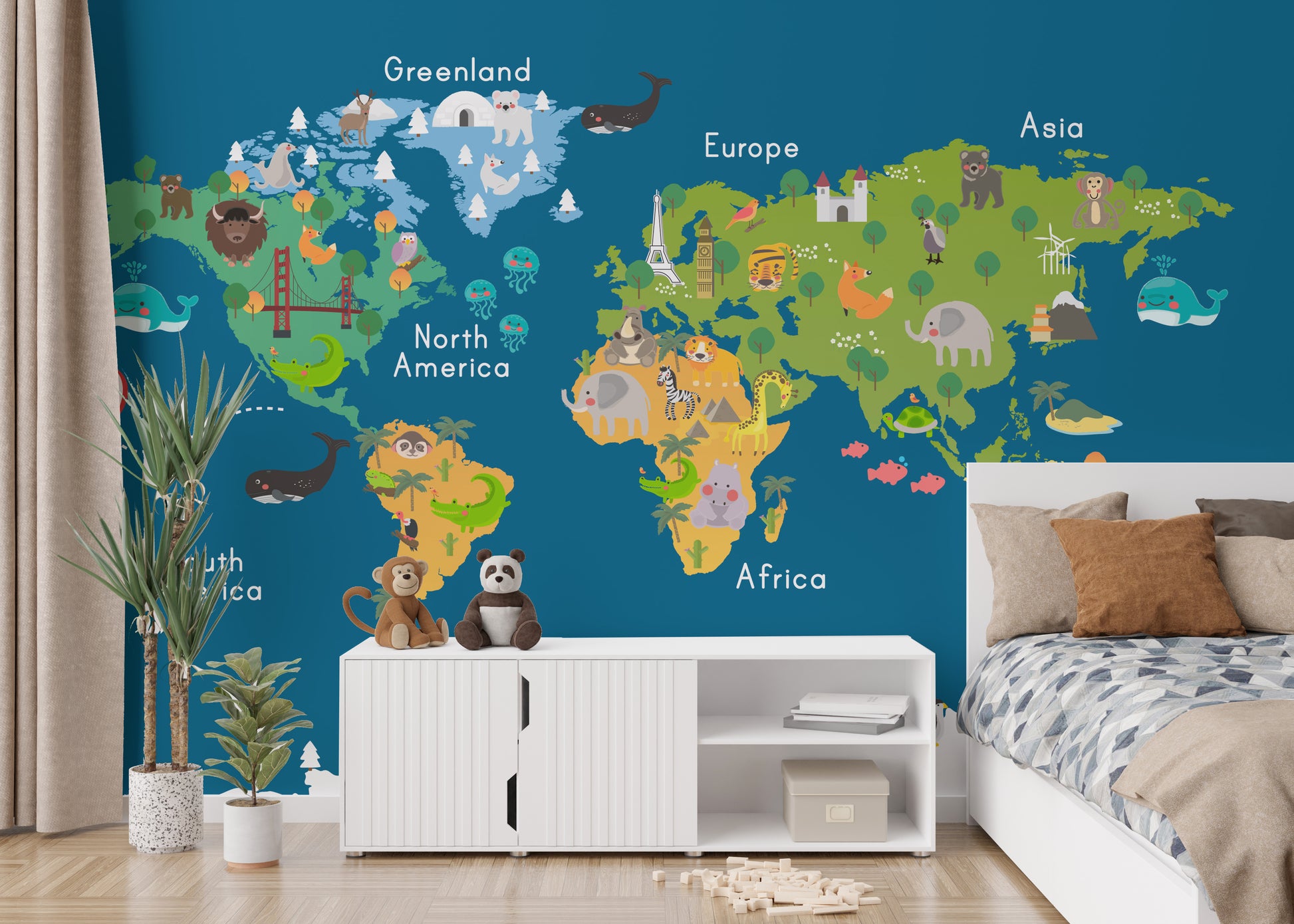 Discover the perfect addition to your child's bedroom with this amazing blue kids world map wallpaper mural! This vibrant wallpaper is sure to bring life and a playful vibe to your kid's room. It features cheerful cartoon flags from around the world, making it a fun way to teach your little one about different countries and cultures. The pastel colors add a fresh touch to any nursery, playroom, or children’s bedroom and set the stage for endless imaginative adventures. Our blue kids world map animal wallpaper mural can completely transform any space in your home. It is perfect for interior designers looking for a creative way to spruce up any wall. It will also make an ideal housewarming or birthday gift! Don't wait; get yours now and fill your child's room with color, wonder, and adventure!