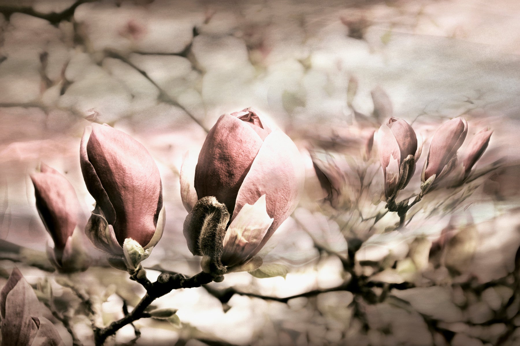 An artistic magnolia bloom mural on minimalist wallpaper.