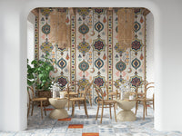 Discover a playful pattern that adds a cheerful vibe to your space. This design includes tribal-inspired medallions, geometric shapes, and charming details. The soft palette of coral, navy, teal, and mustard creates a warm and inviting feel. Perfect wallpaper for walls in a living room, bedroom, or study, this design complements interiors with a mix of bohemian and contemporary styles. It's a great way to add a unique touch to any room.