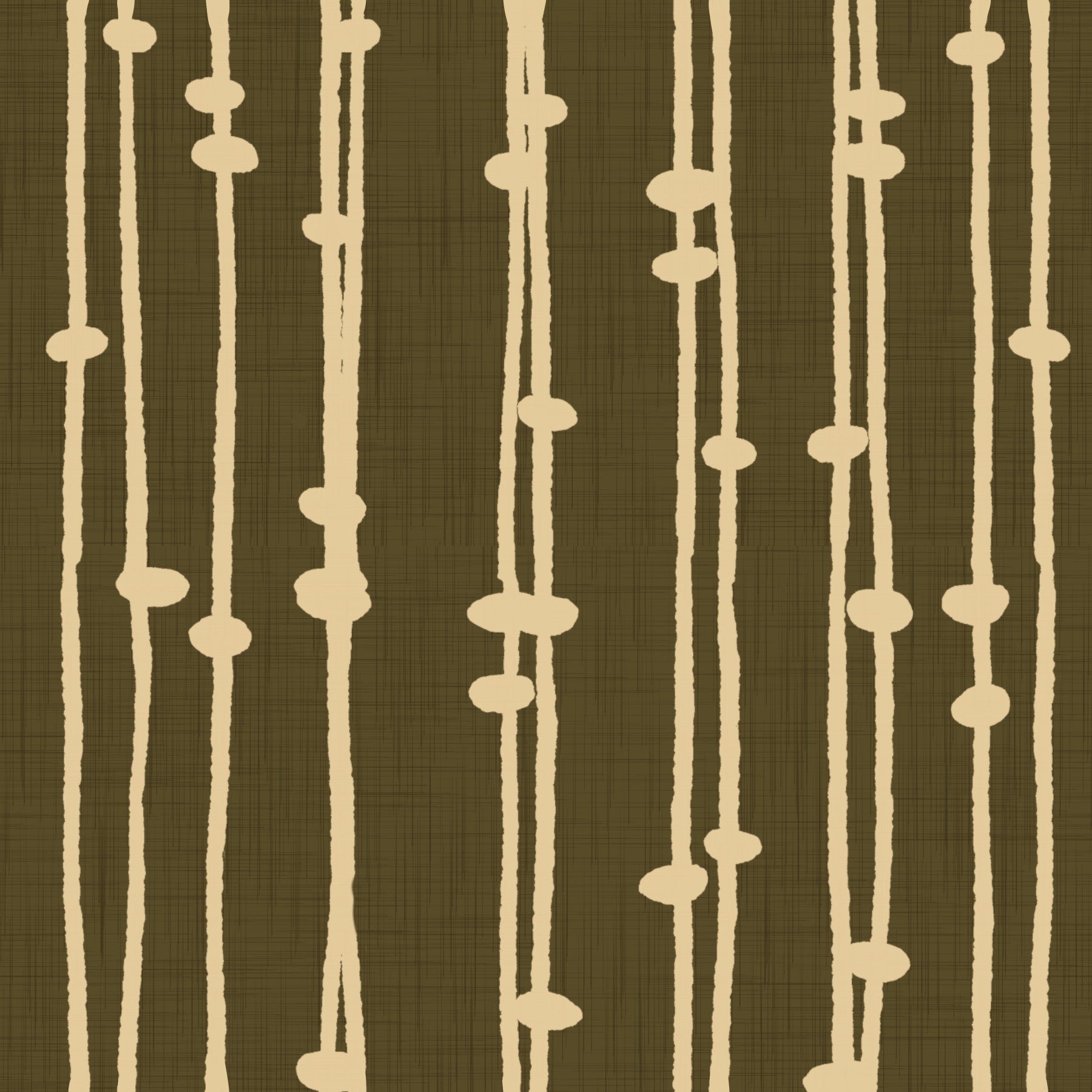 Embrace a vintage-inspired aesthetic with the "Boho Jewel Tone Stripes Retro Dark Olive" wallpaper. This design features bold, vertical stripes in a warm, muted neutral tone against a textured, dark olive backdrop, evoking a sense of earthy sophistication. Reminiscent of mid-century textile designs, the playful arrangement of staggered circles along the stripes adds a touch of bohemian flair. The subtle jewel-toned undertones in the olive background bring depth and richness, making it a versatile choice for any room. Perfect for creating a cozy, inviting atmosphere, this wallpaper combines retro charm with modern sensibilities. Add a touch of curated eclecticism to your living space with this unique and eye-catching design.