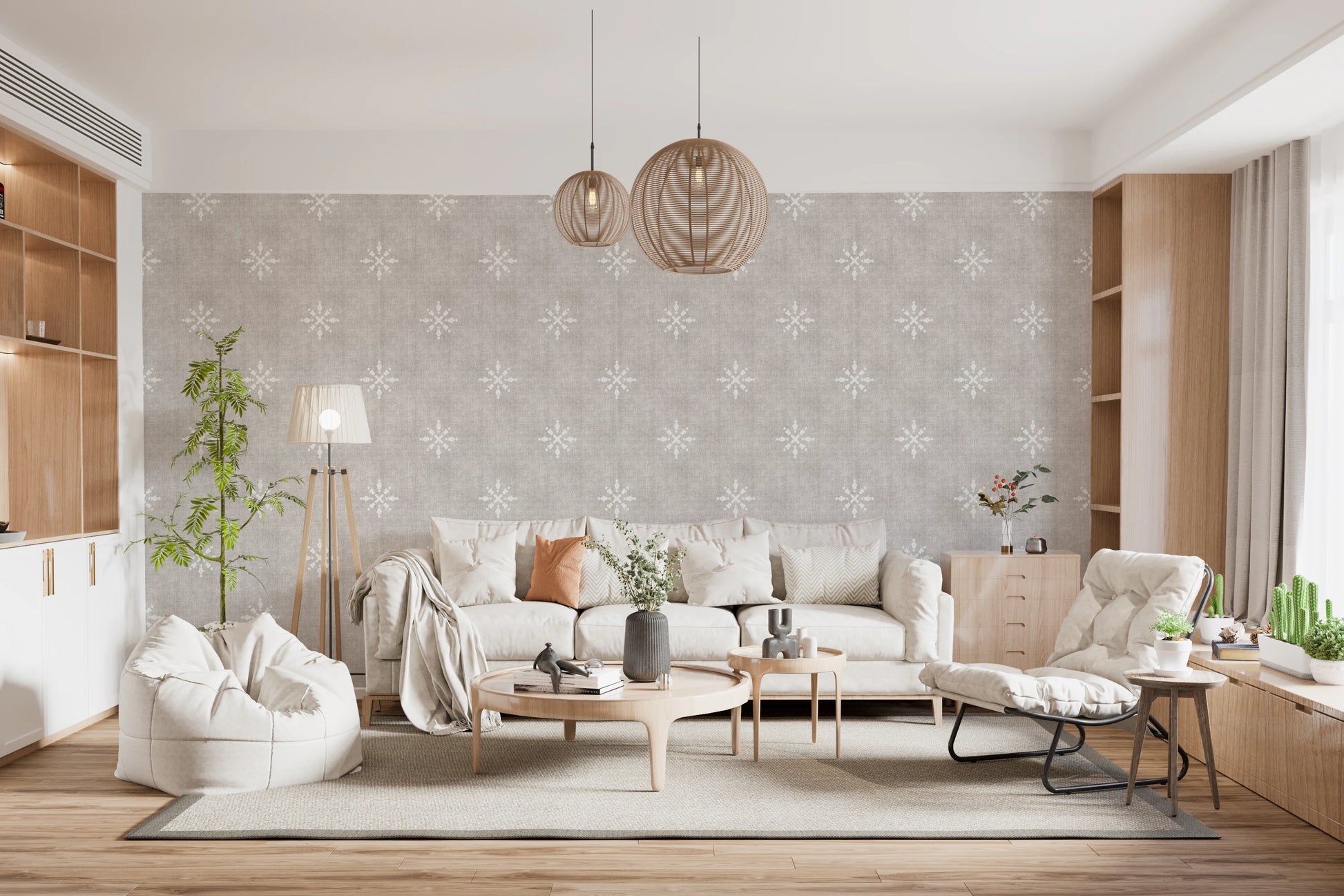 Embrace understated elegance with this 'Boho Minimal Ornament Grunge Neutral' wall covering. The design features delicate, stylized floral ornaments subtly scattered across a textured, neutral backdrop. The intentional 'grunge' effect lends a unique, lived-in feel, adding depth and character to the minimalist aesthetic. This muted color palette evokes a sense of calm and serenity, making it ideal for creating a relaxed and inviting atmosphere. Perfect for adding a touch of bohemian charm to any room, this wall covering effortlessly blends simplicity with subtle ornamentation, creating a sophisticated yet approachable look for your walls.